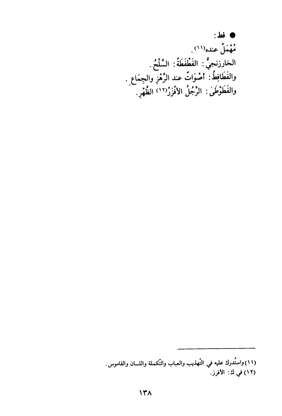 فط : مُهْمَل عنده . الخارزنجيُّ : الفَطْفَطَةُ : السلْحُ . والفَطَافِطُ : أصْوَاتٌ عند الرهْزِ والجِمَاعِ . والفَطَوْطَن : الرجُلُ الأفْزَرُ الظَّهْرِ .