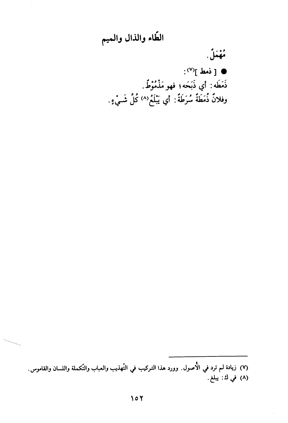 مُهْمَل . ذمط ذَمَطَه : أي ذَبَحَه ؛ فهو مَذْمُوْظ . وفلانٌ ذُمَطَةٌ سُرَطَةٌ : أي يَبْلَعُ كُل شَيْءٍ .
