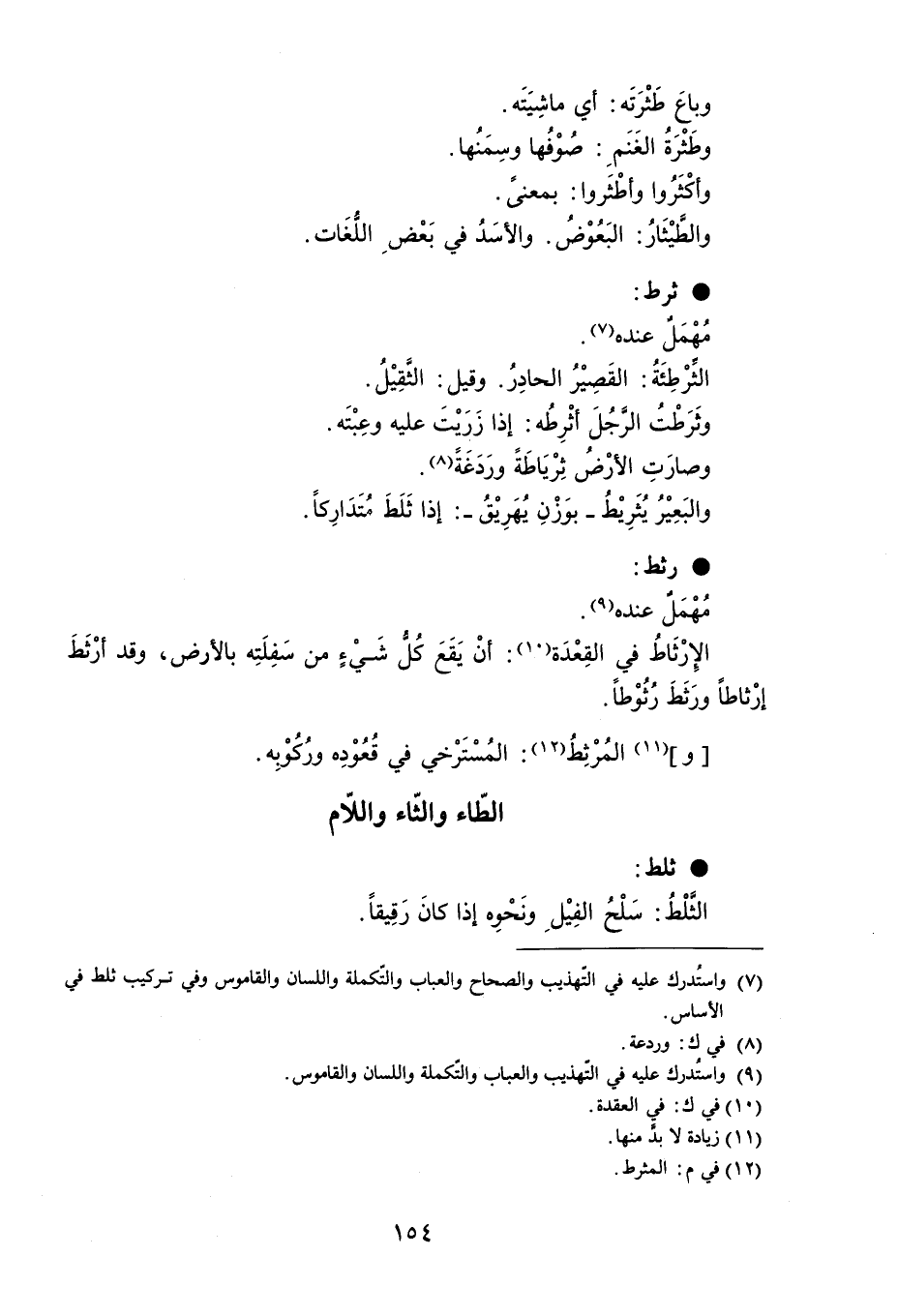 وباعَ طَثْرَتَه : أي ماشِيَتَه . وطَثْرَةُ الغَنَمِ : صُوْفُها وسِمَنُها . وأكْثَرُوا وأطْثَروا : بمعنى . والطَيْثَارُ : البَعُوْضُ . والأسَدُ في بَعْض اللُّغَات . ثرط مُهْمَلٌ عنده . الثرْطِئَةُ : القَصِيْرُ الحادِرُ . وقيل : الثَّقِيْلُ . وثَرَطْتُ الرجُلَ أثْرِطُه : إذا زَرَيْتَ عليه وعِبْتَه . وصارَتِ الأرْضُ ثِرْيَاطَةً ورَدَغَةً . والبَعِيْرُ يُثَرِيْطُ - بوَزْنِ يُهَرِيْقُ - : إذا ثَلَطَ ، متَدَارِكاً . رثط مُهْمَل عنده . الإرْثَاطُ في القِعْدَة : أنْ يَقَعَ كُلُّ شَيْءٍ من سَفِلَتِه بالأرض ، وقد أرْثَطَ إرْثاطاً ورَثَطَ رُثُوْطاً . والمُرْثِطُ : المُسْتَرْخي في قُعُوْدِه ورُكُوْبِه .