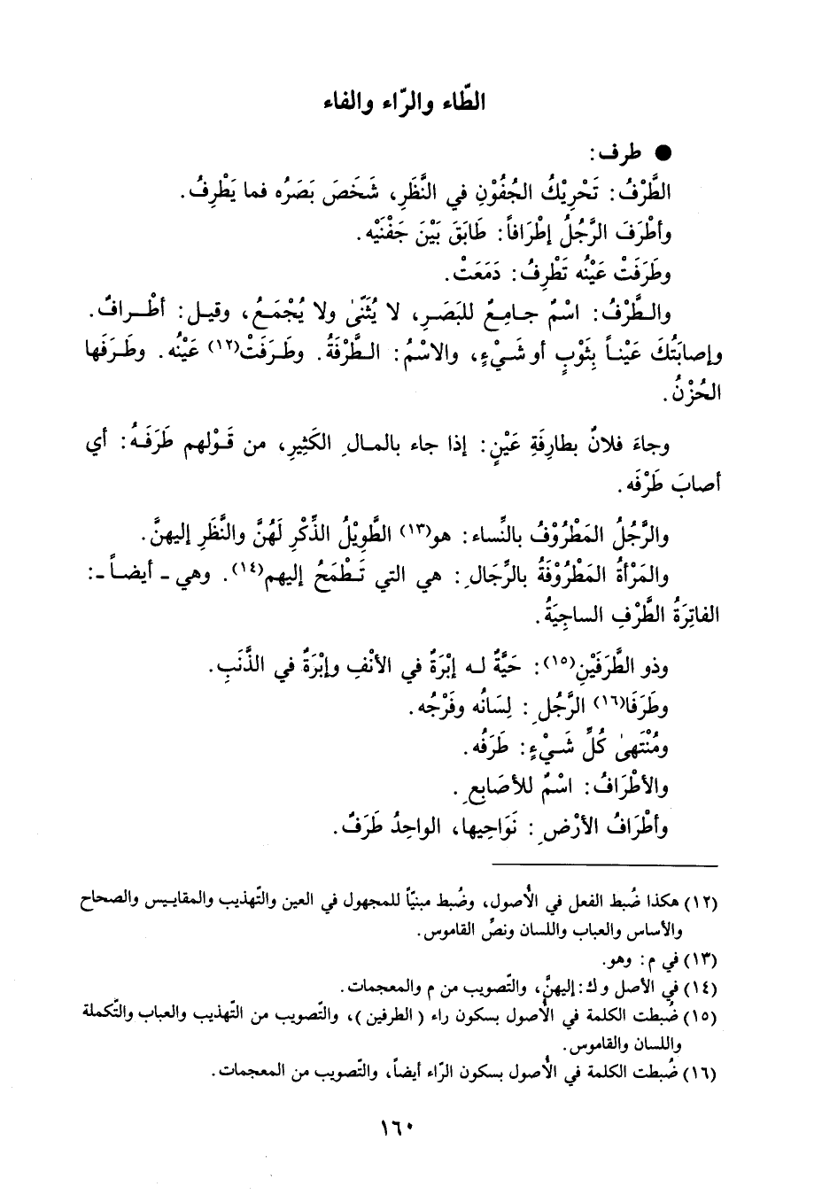طرف الطَرْفُ : تَحْرِيْكُ الجُفُوْنِ في النَّظَرِ ، شَخَصَ بَصَرُه فما يَطْرِفُ . وأطْرَفَ الرَّجُلُ إطْرَافاً : طَابَقَ بَيْنَ جَفْنَيْه . وطَرَفَتْ عَيْنُه تَطْرِفُ : دَمَعَتْ . والطَرْفُ : اسْمٌ جامِعٌ للبَصَرِ ، لا يُثَنّى ولا يُجْمَعُ ، وقيل : أطْرافٌ . وإصابَتُكَ عَيْناً بِثَوْبٍ أوشَيْء ، والاسْمُ : الطَرْفَةُ . وطَرَفَتْ عَيْنُه . وطَرَفَها الحُزْنُ . وجاءَ فلانٌ بطارِفَةِ عَيْني : إذا جاء بالمالِ الكَثِيرِ ، من قَوْلهم طَرَفَهُ : أي أصابَ طَرْفَه . والرجُلُ المَطْرُوْفُ بالنساء : هو الطَّويلُ الذَكْرِ لَهُنَ والنَظَرِ إليهنَ . والمَرْأةُ المَطْرُوْفَةُ بالرجَالِ : هي التي تَطْمَحُ إليهم . وهي - أيضاً - : الفاتِرَةُ الطَرْفِ الساجِيَةُ . وذو الطَرَفَيْنِ : حَيةٌ له إبْرَة في الأنْفِ وإبْرَةٌ في الذَنَبِ . وطَرَفَا الرَّجُلَ : لِسَانُه وفَرْجُه . ومُنْتَهى كُل شَيْءٍ : طَرَفُه . والأطْرَافُ : اسْم للأصَابع . وأطْرَافُ الأرْضِ : نَوَاحِيها ، الواحِدُ طَرَفٌ .