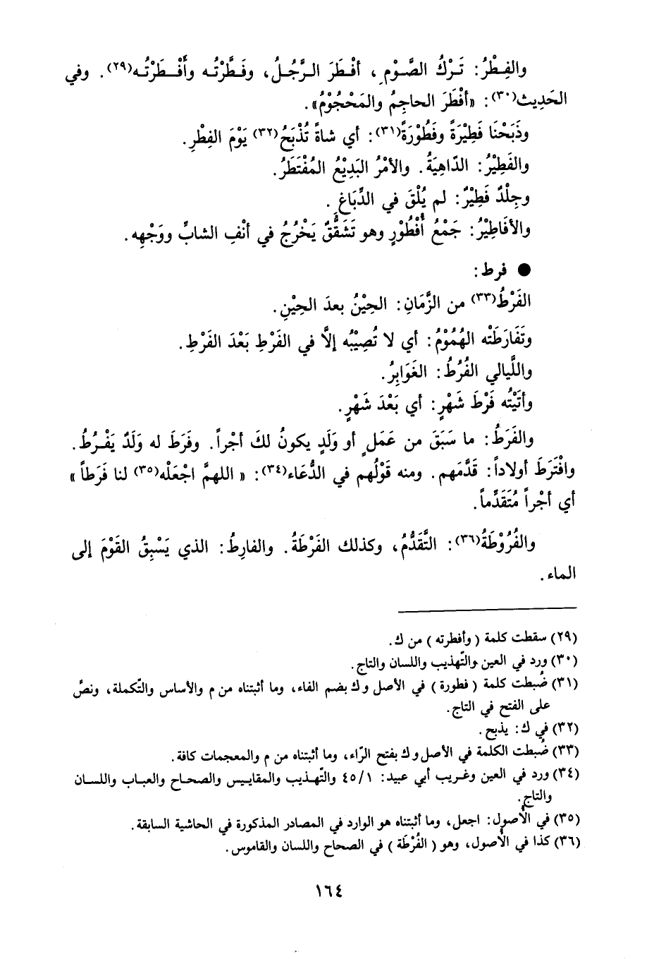 والفِطْرُ : تَرْكُ الصَّوْمِ ، أفْطَرَ الرَّجُلُ ، وفَطَّرْتُه وأفْطَرْتُه . وفي الحَدِيث : ' أفْطَرَ الحاجِمُ والمَحْجُوْمُ ' . وذَبَحْنَا فَطِيْرَةً وفَطُوْرَة : أي شاةً تُذْبَحُ يَوْمَ الفِطْرِ . والفَطِيْرُ : الداهِيَةُ . والأمْرُ البَدِيْعُ المُفْتَطَرُ . وجِلْد فَطِيْرٌ : لم يُلْقَ في الدبَاغ . والأفَاطِيْرُ : جَمْعُ أفْطُوْرٍ وهو تَشَققٌ يَخْرُجُ في أنْفِ الشابِّ ووَجْهِه . فرط الفَرْطُ من الزمَانِ : الحِيْنُ بعدَ الحِيْنِ . وتَفَارَطَتْه الهُمُوْمُ : أي لا تُصِيْبُه إلاَّ في الفَرْطِ بَعْدَ الفَرْطِ . والليالي الفُرُطُ : الغَوَابِرُ . وأتَيْتُه فَرْطَ شَهْرٍ : أي بَعْدَ شَهْرٍ . والفَرَطُ : ما سَبَقَ من عَمَلٍ أو وَلَدٍ يكونُ لكَ أجْراً . وفَرَطَ له وَلد يَفْرُطُ . وافْتَرَطَ أولاداً : قَدمَهم . ومنه قَوْلهم في الدُّعَاء : ' اللهمَّ اجْعَلْه لنا فَرَطاً ' أي أجْراً مُتَقَدماً . والفُرُوْطَةُ : التقَدمُ ، وكذلك الفَرْطَةُ . والفارِطُ : الذي يَسْبِقُ القَوْمَ إلى الماء .
