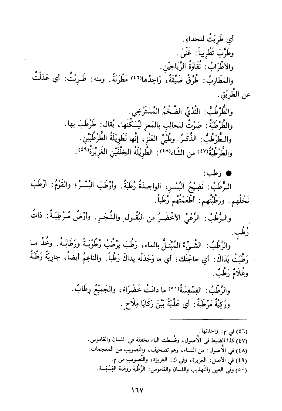أي طَرِبَتْ للحداءِ . وطَربَ تَطْرِيباً : غَنى . والأطْرَابُ : نُقَاوَةُ الرَّيَاحِيْنِ . والمَطَارِبُ : طُرُقٌ ضَيِّقَةٌ ، وَاحِدُها مَطْرَبَةٌ . ومنه : طَرِبْتُ : أي عَدَلْتُ عن الطَّرِيْقِ . والطُرْطُب : الثَّدْيُ الضَخْمُ المُسْتَرْخِي . والطَرْطَبَةُ : صَوْت للحالِبِ بالمَعزِ ليُسَكِّنَها ، يُقال : طَرْطَبَ بها . والطرْطُبُّ : الذكَرُ . وطُبْيُ العَنْزِ ، إنَها لَطَوِيْلَةُ الطُرْطُبَيْنِ . والطُرْطُبَّةُ من الشاء : الطويلَةُ الخِلْفَيْنِ الغَزِيْرَةُ . رطب الرطَبُ : نَضِيْجُ البُسْرِ ، الواحِدَةُ رُطَبَةٌ . وأرْطَبَ البُسْرُ ؛ والقَوْمُ : أرْطَبَ نَخْلُهم . ورَطَبْتُهم : أطْعَمْتُهُم رُطَباً . والرُطْبُ : الرعْيُ الأخْضَرُ من البُقُولِ والشجَرِ . وأرْض مُرْطِبَةٌ : ذاتُ رُطْبٍ . والرطْبُ : الشيْءُ المُبْتَلُّ بالماء ، رَطُبَ يَرْطُبُ رُطُوْبَةً ورَطَابَةً . وخُذْ ما رَطَبَتْ يَدَاكَ : أي حاجَتَك ؛ أي ما وَجَدَتْه يداكَ رَطْباً . والناعِمُ أيضاً ، جارِيَةٌ رَطْبَةٌ وغُلام َرَطْبٌ . والرطْبُ : الفِسْفِسَةُ ما دامَتْ خَضْرَاءَ ، والجَمِيْعُ رِطَاب . ورَكِيَّةٌ مَرْطَبَةٌ : أي عَذْبَةٌ بَيْنَ رَكَايَا مِلاحٍ .