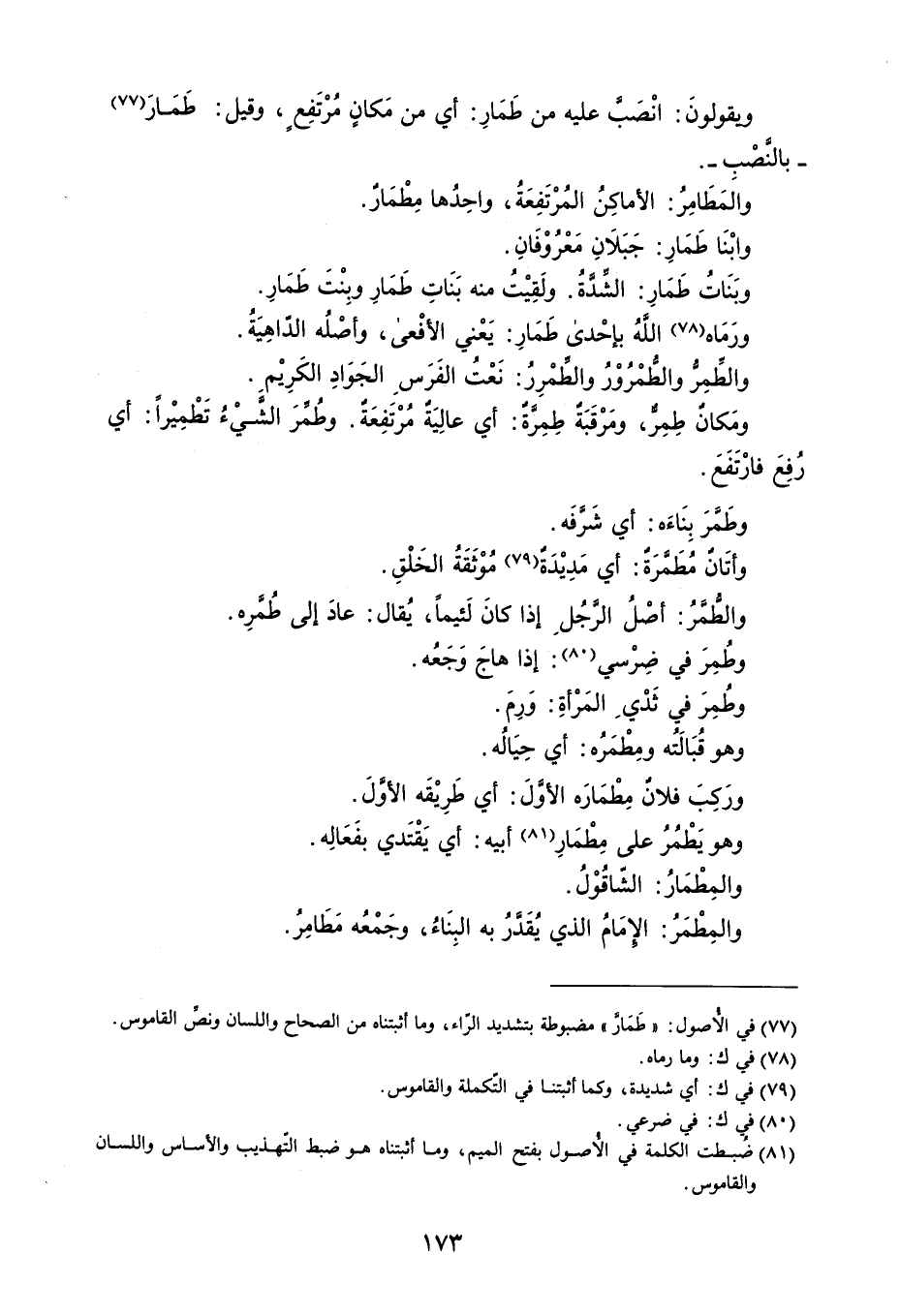 ويقولونَ : انْصب عليه من طَمَارِ : أي من مَكانٍ مُرْتَفِعٍ ، وقيل : طَمَارَ - بالنصْبِ - . والمَطَامِرُ : الأماكِنُ المُرْتَفِعَةُ ، واحِدُها مِطْمَار . وابْنَا طَمَارِ : جَبَلاَنِ مَعْرُوْفَانِ . وبَنَاتُ طَمَارِ : الشدَّةُ . ولَقِيْتُ منه بَنَاتِ طَمَارِ وبِنْتَ طَمَارِ . ورَمَاه اللَّهُ بإحْدى طَمَارِ : يَعْني الأفْعى ، وأصْلُه الدّاهِيَةُ . والطَمِر والطمْرُوْرُ والطَمْرِرُ : نَعْتُ الفَرَسِ الجَوَادِ الكَرِيْمِ . ومَكان طِمِر ، ومَرْقَبَةٌ طِمِرَّةٌ : أي عالِيَةٌ مُرْتَفِعَةٌ . وطُمّرَ الشيْءُ تَطْمِيْراً : أي رُفِعَ فارْتَفَعَ . وطَمرَ بِنَاءه : أي شَرفَه . وأتَان مُطَقَرَةُ : أي مَدِيْدَةٌ مُوثقَةُ الخَلْقِ . والطُمرُ : أصْلُ الرَّجُلِ إذا كانَ لَئيماً ، يُقال : عادَ إلى طُمَّرِه . وطُمِرَ في ضِرْسي : إذا هاجَ وَجَعُه . وطُمِرَ في ثَدْيِ المَرْأةِ : وَرِمَ . وهو قُبَالَتُه ومِطْمَرُه : أي حِيَالُه . ورَكِبَ فلان مِطْمَارَه الأوَّلَ : أي طَرِيْقَه الأوَّلَ . وهو يَطْمُرُ على مِطْمَارِ أبيه : أي يَقْتَدي بفَعَالِه . والمِطْمَارُ : الشّاقُوْلُ . والمِطْمَرُ : الإمَامُ الذي يُقَدَّرُ به البِنَاءُ ، وجَمْعُه مَطَامِرُ . وأطْمَرَ