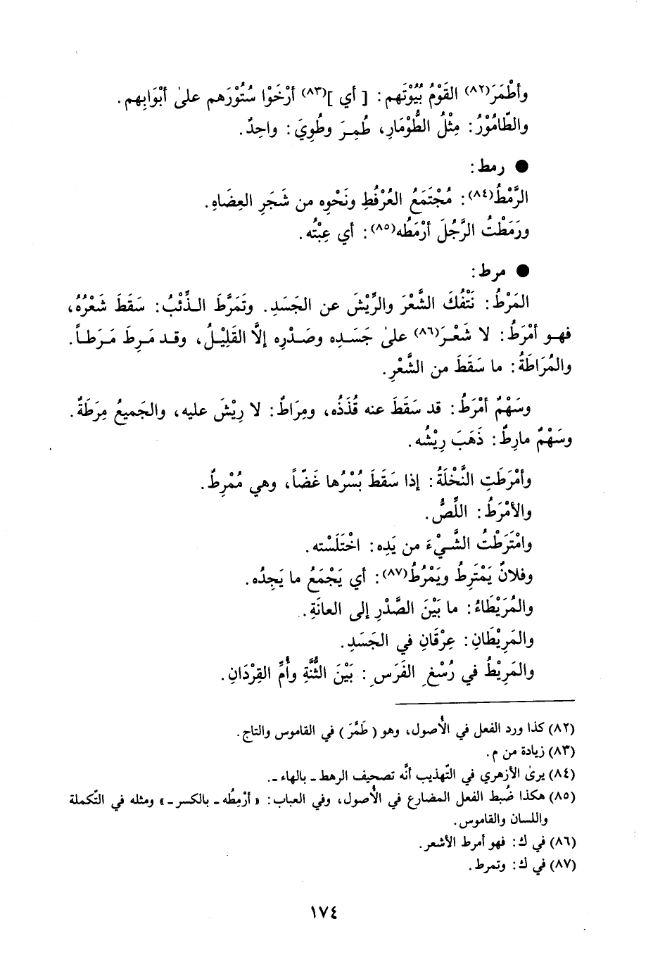 القَوْمُ بُيُوْتَهم : أي أرْخَوْا سُتُوْرَهم على أبْوَابِهم . والطّامُوْرُ : مِثْلُ الطُّوْمَارِ ، طمر وطُوِيَ : واحِدٌ . رمط الرمْطُ : مجْتَمَعُ العُرْفُطِ ونَحْوِه من شَجَرِ العِضَاهِ . ورَمَطْتُ الرجُلَ أرْمَطُه : أي عِبْتُه . مرط المَرْطُ : نَتْفُكَ الشعْرَ والرِّيْشَ عن الجَسَدِ . وتَمَرَّطَ الذِّئْبُ : سَقَطَ شَعْرُهُ ، فهو أمْرَطُ : لا شَعْرَ على جَسَدِه وصَدْرِه إلّاَ القَلِيْلُ ، وقد مَرِطَ مَرَطاً . والمرَاطَةُ : ما سَقَطَ من الشعْرِ . وسَهْم أمْرَطُ : قد سَقَطَ عنه قُذَذُه ، ومِرَاطٌ : لا رِيْشَ عليه ، والجَميعُ مِرَطَةٌ . وسَهْمٌ مارِطٌ : ذَهَبَ رِيْشُه . وأمْرَطَتِ النَّخْلَةُ : إذا سَقَطَ بُسْرُها غَضاً ، وهي مُمْرِطٌ . والأمْرَطُ : اللِّصُّ . وامْتَرَطْتُ الشيْءَ من يَدِه : اخْتَلَسْته . وفلان يَمْتَرِطُ وَيمْرُطُ : أي يَجْمِعُ ما يَجِدُه . والمُرَيْطَاءُ : ما بَيْنَ الصدْرِ إلى العانةِ . والمَرِيْطَانِ : عِرْقَانِ في الجَسَدِ . والمَرِيْطُ في رُسْغِ الفَرَسِ : بَيْنَ الثُّنَةِ وأمِّ القِرْدَانِ .