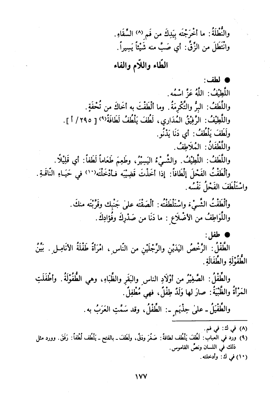 لطف اللطِيْفُ : اللَهُ عَزَ اسْمُه . واللَّطَفُ : البِرًّ والتَّكْرِمَةُ . وما ألْطَفْتَ به أخَاكَ من تُحْفَةٍ . واللَطِيْفُ : الرَّفِيْقُ المُدَاري ، لَطُفَ يَلْطُفُ لَطَافَةً . ولَطَفَ يَلْطُفُ : أي دَنَا يَدْنُو . واللَّطْفَانُ : المُلاطِفُ . واللطَفُ : اللَّطِيْفُ . والشيْءُ اليَسِيْرُ ، وطَعِمَ طَعَاماً لَطَفاً : أي قَلِيْلاً . وألْطَفْتُ الفَحْلَ إلْطَافاً : إذا أخَذْتَ قَضِيْبَه فادْخَلْتَه في حَيَاء النّاقَةِ . واسْتَلْطَفَ الفَحْلُ نَفْسُه . وألْطَفْتُ الشيْءَ واسْتَلْطَفْتُه : ألْصَقْتَه على جَنْبِك وقَرَّبْتَه منكَ . واللوَاطِفُ من الأضْلاَع : ما دَنَا من صَدْرِكَ وفُؤادِكَ . طفل الطَّفْلُ : الرخْصُ اليِدَيْنِ والرجْلَيْنِ من الناسِ ، امْرَأة طَفْلَةُ الأنَامِلِ . بَينُ الطفُوْلَةِ والطَّفَالَةِ . والطفْلُ : الصغِيْرُ من أوْلاَدِ الناسِ والبَقَرِ والظبَاءِ ، وهي الطفُوْلَةُ . وأطْفَلَتِ المَرْأةُ والظَّبْيَةُ : صارَ لها وَلَد طِفْل ، فهي مُطْفِلٌ . والطفْيَلُ - على حِذْيَم - : الطفْلُ ، وقد سَمتِ العَرَبُ به .