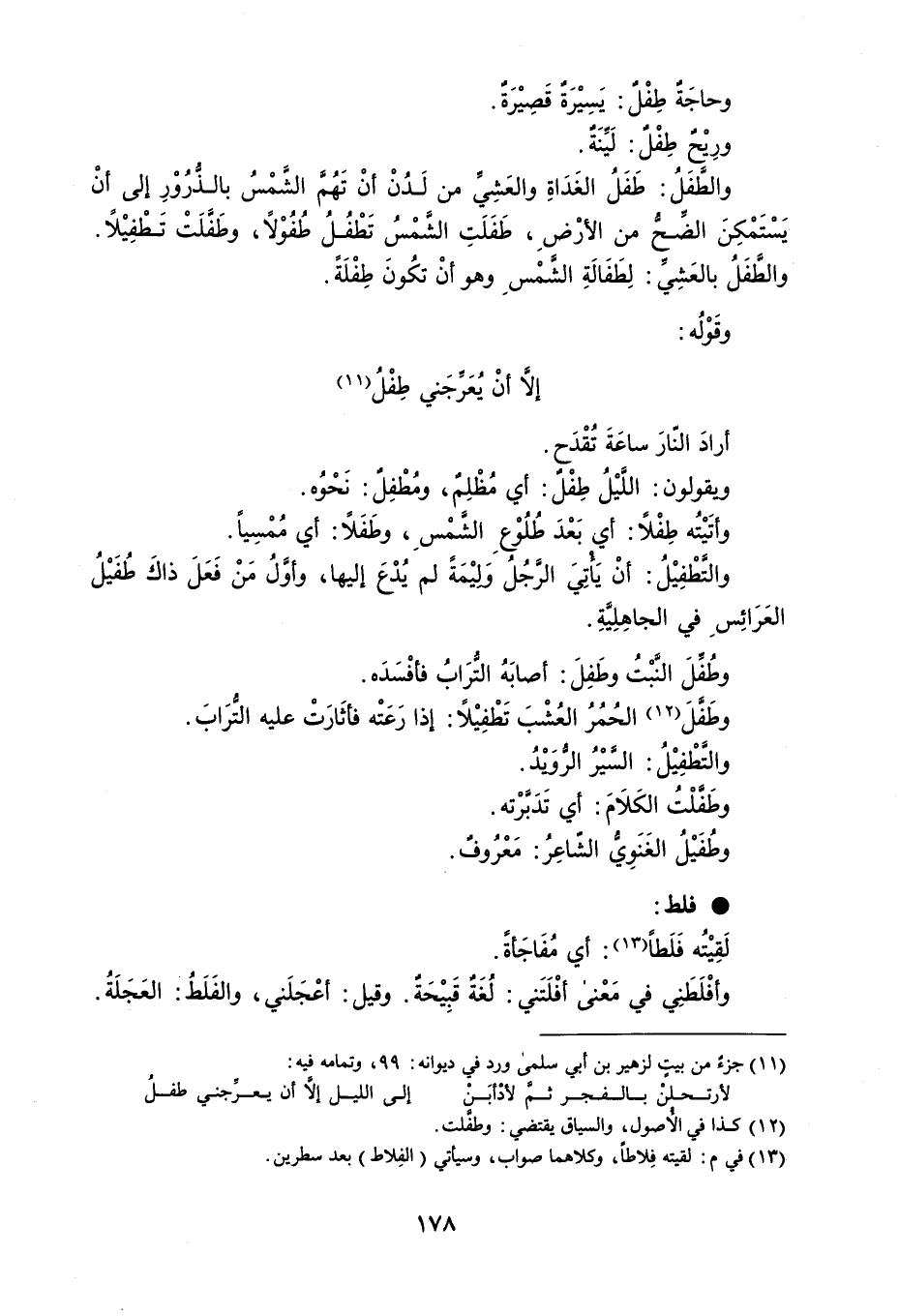 وحاجَةٌ طِفْلٌ : يَسِيْرَةٌ قَصِيْرَة . ورِيْحٌ طِفْلٌ : لَيِّنَةٌ . والطَّفَلُ : طَفَلُ الغَدَاةِ والعَشِيِّ من لَدُنْ أنْ تَهُمَّ الشَّمْسُ بالذُّرُوْرِ إلى أنْ يَسْتَمْكِنَ الضِّحُّ من الأرْضِ ، طَفَلَتِ الشَّمْسُ تَطْفُل طُفُوْلاً ، وطَفَّلَتْ تَطْفِيْلاً . والطَّفَلُ بالعَشِيِّ : لِطَفَالَةِ الشَّمْسِ وهو أنْ تكُونَ طِفْلَةً . وقَوْلُه : إلآَ أنْ يُعَرِّجَني طِفْلُ أرادَ النّارَ ساعَةَ تُقْدَح . ويقولون : اللَّيْلُ طِفْلٌ : أي مُظْلِمٌ ، ومُطْفِلٌ : نَحْوُه . وأتَيْتُه طِفْلاً : أي بَعْدَ طُلُوْعِ الشمْسِ ، وطَفَلاً : أي مُمْسِياً . والتطْفِيْلُ : أنْ يَأتِيَ الرَّجُلُ وَليْمَةً لم يُدْعَ إليها ، وأوَّلُ مَنْ فَعَلَ ذاكَ طُفَيْلُ العَرَائِسِ في الجاهِلِيَّةِ . وطُفِّلَ النَّبْت وطَفِلَ : أصابَهُ التُّرَابُ فأفْسَدَه . وطَفلَ الحُمُرُ العُشْبَ تَطْفِيْلاً : إذا رَعَتْه فأثَارَتْ عليه التُّرَابَ . والتَطْفِيْلُ : السيْرُ الروَيْدُ . وطَفلْتُ الكَلامَ : أي تَدَبَرْته . وطُفَيْلُ الغَنَوِيُ الشّاعِرُ : مَعْرُوفٌ . فلط لَقِيْتُه فَلَطاً : أي مُفَاجَاةً . وأفْلَطَنِي في مَعْنى أفْلَتَني : لُغَةٌ قَبِيْحَةٌ . وقيل : أعْجَلَني ، والفَلَطُ : العَجَلَةُ .
