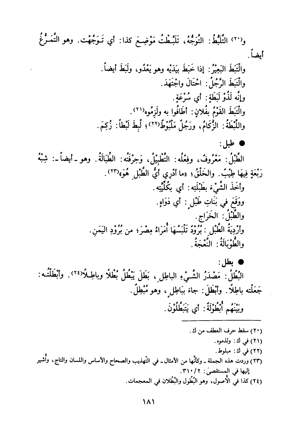 والتَّلَبطُ : التوَجُّهُ ، تَلَبطْتُ مَوْضِعَ كذا : أي تَوَجَّهْت . وهو التمَرُّغُ أيضاً . والْتَبَطَ البَعِيْرُ : إذا خَبَطَ بيَدَيْه وهو يَعْدُو ، ولَبَطَ أيضاً . والْتَبَطَ الرَّجُلُ : احْتَالَ واجْتَهَدَ . وإنه لَذُوْ لَبَطَةٍ : أي سُرْعَةٍ . والْتَبَطَ القَوْمُ بفُلانٍ : أطَافُوا به ولَزِمُوه . واللَبْطَةُ : الزُكَامُ ، ورَجُلٌ مَلْبُوْطٌ ؛ لُبِطَ لَبْطاً : زُكِمَ . طبل الطَّبْلُ : مَعْرُوفٌ ، وفِعْلُه : التَطْبِيْلُ ، وَحِرْفَتُه : الطبَالَةُ . وهو - أيضاً - : شِبْهُ رَبْعَةٍ فِيهَا طِيْبٌ . والخَلْقُ ؛ ' ما أدْرِي أي الطبْلِ هُوَ ' . وأخَذَ الشيْءَ بطَبْلَتِه : أي بكُليته . ووَقَعَ في بَنَاتِ طَبْلً : أي دَوَاه . والطبْلُ : الخَرَاج . وأرْدِيَةُ الطبْلِ : برُوْدٌ تَلْبَسُهَا أمَرَاءُ مِصْرَ ؛ من بُرُوْدِ اليَمَنِ . والطُّوْبَالَةُ : النَعْجَةُ . بطل البُطْلُ : مَصْدَرُ الشَّيْءِ الباطِلِ ، بَطَلَ يَبْطُلُ بُطْلًا وباطِلاً . وأبْطَلْتُه : جَعَلْته باطِلاً . وأبْطَلَ : جاءَ ببَاطِلٍ ، وهومُبْطِلٌ . وبَيْنَهُم أبْطُوْلَةٌ : أي يَتَبَطَلُوْنَ .