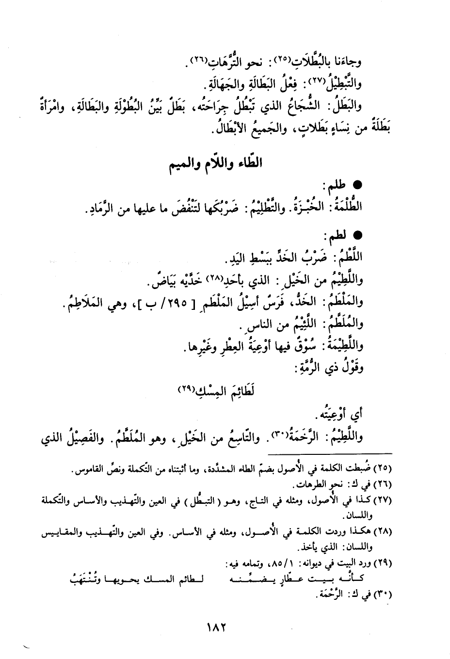 طلم الطلْمَةُ : الخُبْزَةُ . والتطْلِيْمُ : ضَرْبُكَها لتَنْفُضَ ما عليها من الرمَادِ . لطم اللطْمُ : ضَرْبُ الخَد ببَسْطِ اليَدِ . واللطِيْمُ من الخَيْلِ : الذي بأحَدِ خَديْه بَيَاض . والمَلْطَمُ : الخَد ، فَرَسٌ أسِيْلُ المَلْطَمِ ، وهي المَلاَطِمُ . والمُلَطمُ : اللئِيْمُ من الناسِ . واللطِيْمَةُ : سُوْقٌ فيها أوْعِيَةُ العِطْرِ وغَيْرِها . وقَوْلُ ذي الرمةِ : لَطَائِمَ المِسْكِ أي أوْعِيَتُه . واللطِيْمُ : الزخَمَةُ . والتّاسِعُ من الخَيْلِ ، وهو المُلَطَّمُ . والفَصِيْلُ الذي يُفْصَلُ