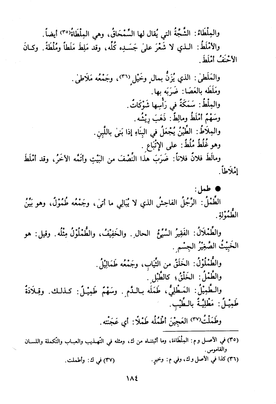 والمِلْطَاءُ : الشجةُ التي يُقال لها السمْحَاقُ ، وهي المِلْطَاةُ أيضاً . والأمْلَطُ : الذي لا شَعْرَ على جَسَدِه كُلَه ، وقد مَلِطَ مَلَطاً ومُلْطَةً . وكانَ الأحْنَفُ أمْلَطَ . والمَلَطى : الذي يُزَنُ بمالٍ وخَيْلٍ ، وجَمْعُه مَلاطن . ومَلَطَه بالعَصَا : ضَرَبَه بها . والمِلْطُ : سَمَكَةٌ في رَأسِها شَوْكَاتٌ . وسَهْمٌ أمْلَطُ ومالِط : ذَهَبَ رِيْشُه . والمِلاَطُ : الطِّيْنُ يُجْعَلُ في البِنَاءِ إذا بَنى باللَّبِنِ . وهو غلط مُلُطٌ : على الإتْبَاعِ . ومالَطَ فلانٌ فلاناً : ضَرَبَ هذا النِّصْفَ من البَيْتِ وأتَمَّه الآخَرُ ، وقد أمْلَطَ إمْلَاطاً . طمل الطَمْلُ : الرجُلُ الفاحِشُ الذي لا يُبَالِي ما أتى ، وجَمْعُه طُمُوْد ، وهو بَينُ الطُّمُوْلةِ . والطِّمْلاَلُ : الفَقِيرُ السيء الحالِ . والخَفِيْفُ ، والطًّمْلُوْلُ مِثْلُه . وقيل : هو الخَبِيْثُ الصَّغِيْرُ الجِسْمِ . والطُّمْلُوْلُ : الخَلَقُ من الثيَابِ ، وجَمْعُه طَمَالِيْلُ . والطمْلُ : الخَلْقُ ؛ كالطَبْلِ . والطمِيْلُ : المَطْلِيُّ ، طَمَلَه بالدمِ . وسَهْمٌ طَمِيْلٌ : كذلك . وقِلادَةٌ طَمِيْلٌ : مَطْلِيَّةٌ بالطيْبِ . وطَمَلْتُ العَجِيْنَ أطْمُلُه طَمْلاً : أي عَجَنْته .