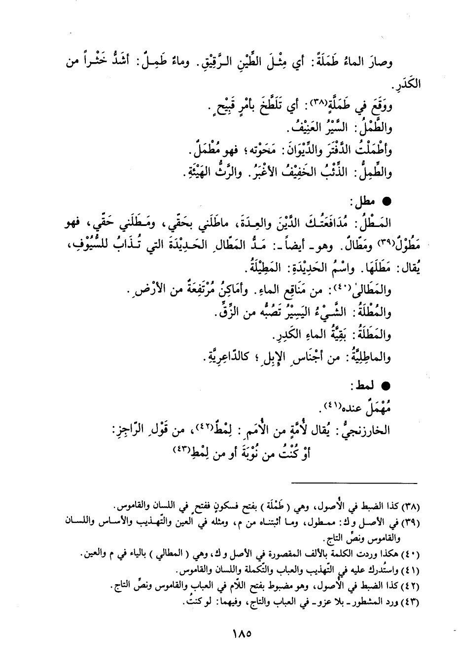وصارَ الماءُ طَمَلَةً : أي مِثْلَ الطَيْنِ الرَّقِيْقِ . وماءٌ طَمِلٌ : أشَد خَثْراً من الكَدَرِ . ووَقَعَ في طَمَلةٍ : أي تَلَطخَ بأمْرٍ قَبِيْحٍ . والطَمْلُ : السيْرُ العَنِيْفُ . وأطْمَلْتُ الدفْتَرَ والدَيْوَانَ : مَحَوْته ؛ فهو مُطْمَلٌ . والطَمِلُّ : الذَئْبُ الخَفِيْفُ الأغْبَرُ . والرَّثُّ الهَيْئَةِ . مطل المَطْلُ : مُدَافَعَتُكَ الدَّيْنَ والعِدَةَ ، ماطَلَني بحَقّي ، ومَطَلَني حَقي ، فهو مَطُوْل ومَظال . وهو - أيضاً - : مَدُّ المَطّالِ الحَدِيْدَةَ التي تُذَابُ للسيُوْفِ ، يُقال : مَطَلَهَا . واسْمُ الحَدِيْدَةِ : المَطِيْلَةُ . والمَطَالى : من مَنَاقِع الماءِ . وأمَاكِن مُرْتَفِعَةٌ من الأرْضِ . والمُطْلَةُ : الشَّيْءُ اليَسِيْر ُتَصُبه من الزق . والمَطَلَةُ : بَقِيَّةُ الماءِ الكَدِرِ . والماطِلِيةُ : من أجْنَاسِ الإبِلِ ؛ كالداعِرِيةِ . لمط : مُهْمَل عنده . الخارزنجيُّ : يُقال لأمةٍ من الأمَمِ : لِمط ، من قَوْلِ الرّاجِزِ : أوْكُنْتُ من نُوْبَةَ أومن لِمْطِ