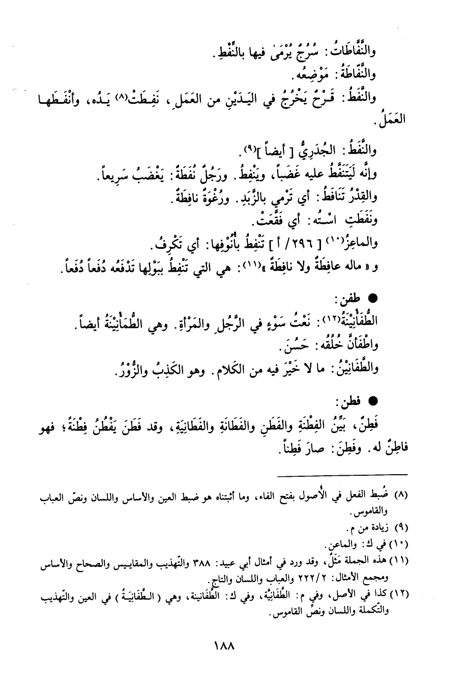 والنفاطَاتُ : سرُجٌ يُرمَى فيها بالنِّفْطِ . والنفّاطَةُ : مَوْضِعُه . والنفَطُ : قَرْحٌ يَخْرُجُ في اليَدَيْنِ من العَمَلِ ، نَفِطَتْ يَدُه ، وأنْفَطَها العَمَلُ . والنَفَطُ : الجُدَرِيُّ أيضاً . وإنه لَيَتَنَفَّطُ عليه غَضَباً ، وَينْفِطُ . ورَجُلٌ نُفَطَةٌ : يَغْضَبُ سَرِيعاً . والقِدْرُ تَنَافَطُ : أي تَرْمي بالزبَدِ . ورُغْوَةٌ نافِطَةٌ . ونَفَطَتِ اسْتُه : أي فَقَعَتْ . والماعِزُ تَنْفِطُ بأنوْفِها : أي تَكْرِفُ . و ' ماله عافِطَة ولا نافِطَةٌ ' : هي التي تَنْفِطُ ببَوْلِها تَدْفَعُه دُفَعاً دُفَعاً . طفن الطُّفَانِيْنَة : نَعْتُ سَوْءٍ في الرَّجُلِ والمَرْأةِ . وير الطمَأنِيْنَةُ أيضاً . واطْفَأنَّ خُلُقُه : حَسُنَ . والطَفَانِيْنُ : ما لا خَيْرَ فيه من الكَلام . وهو الكَذِبُ والزُّوْرُ . فطن فَطِنٌ ، بَينُ الفِطْنَةِ والفَطَنِ والفَطَانَةِ والفَطَانِيَةِ ، وقد فَطَنَ يَفْطُنُ فِطْنَةً ؛ فهو فاطِنٌ له . وفَطِنَ : صار فَطِناً .