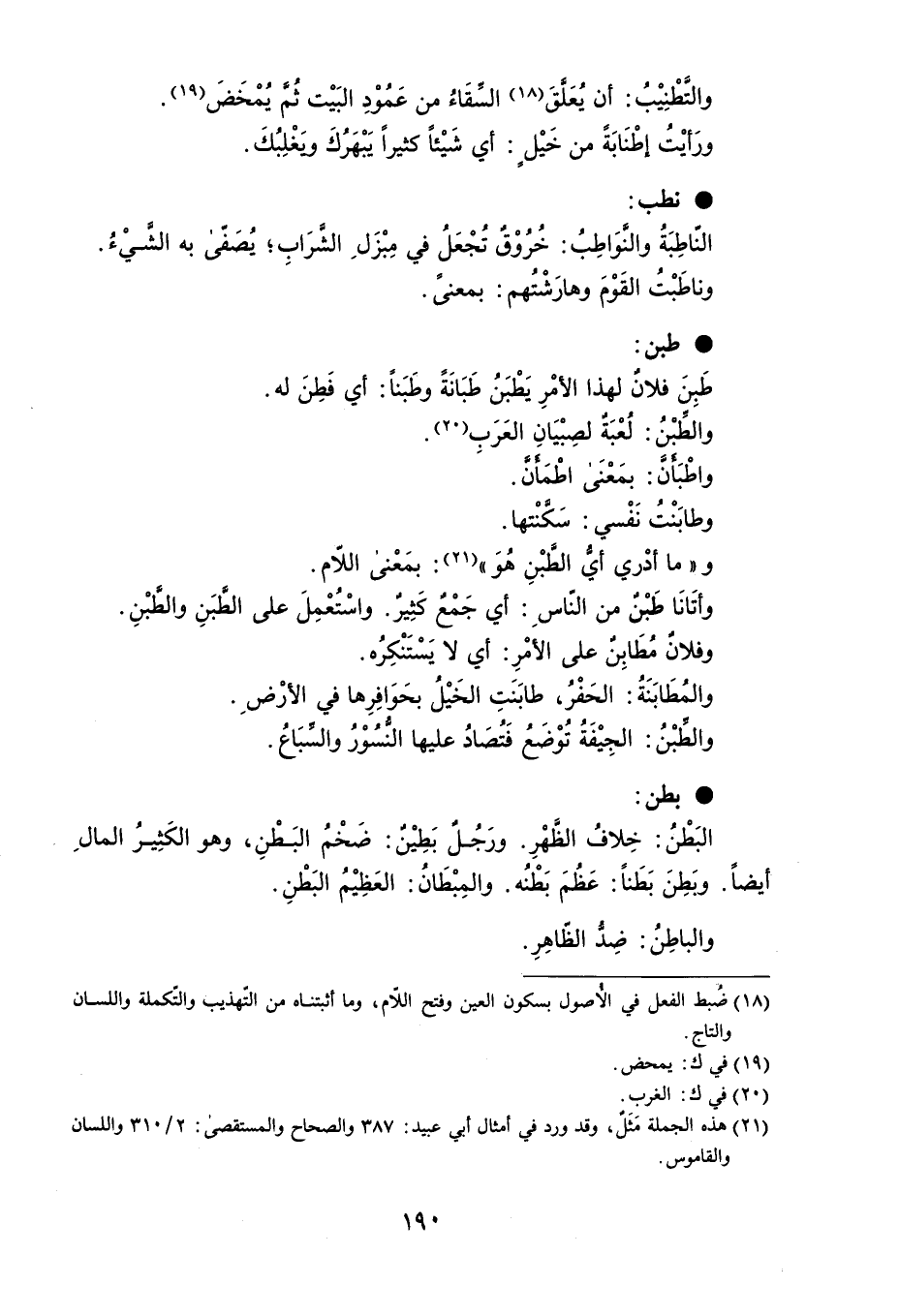 والتَطْنِيْبُ : أن يُعَلَّقَ السقَاءُ من عَمُوْدِ البَيْت ثُمَّ يُمْخَضَ . ورَأيْتُ إطْنَابَةً من خَيْلٍ : أي شَيْئاً كثيراً يَبْهَرُكَ ويَغْلِبُكَ . نطب النّاطِبَةُ والنَوَاطِبُ : خُرُوْقٌ تُجْعَلُ في مِبْزَلِ الشَّرَابِ ؛ يُصَفّى به الشَّيْءُ . وناطَبْتُ القَوْمَ وهارَشْتُهم : بمعنىً . طبن طَبِنَ فلانٌ لهذا الأمْرِ يَطْبَنُ طَبَانَةً وطَبَناً : أي فَطِنَ له . والطَبْنُ : لُعْبَةٌ لصِبْيَانِ العَرَبِ . واطْبَأنَ : بمَعْنَى اطْمَأنَّ . وطابَنْتُ نَفْسي : سَكَّنْتها . و ' ما أدْري أيُ الطبْنِ هُوَ ' : بمَعْنى اللام . وأتَانَا طَبْنٌ من النّاسِ : أي جَمْعٌ كَثِيرٌ . واسْتُعْمِلَ على الطَّبَنِ والطَّبْنِ . وفلانٌ مُطَابِنٌ على الأمْرِ : أي لا يَسْتَنْكِرُه . والمُطَابَنَةُ : الحَفْرُ ، طابَنَتِ الخَيْلُ بحَوَافِرِها في الأرْضِ . والطِّبْنُ : الجِيْفَةُ تُوْضَعُ فَتُصَادُ عليها النُّسُوْرُ والسِّبَاعُ . بطن البَطْنُ : خِلافُ الظَهْرِ . ورَجُلٌ بَطِيْنٌ : ضَخْمُ البَطْنِ ، وهو الكَثِيرُ المالِ أيضاً . وبَطِنَ بَطَناً : عَظُمَ بَطْنُه . والمِبْطَانُ : العَظِيْمُ البَطْنِ . والباطِنُ : ضِد الظّاهِرِ .