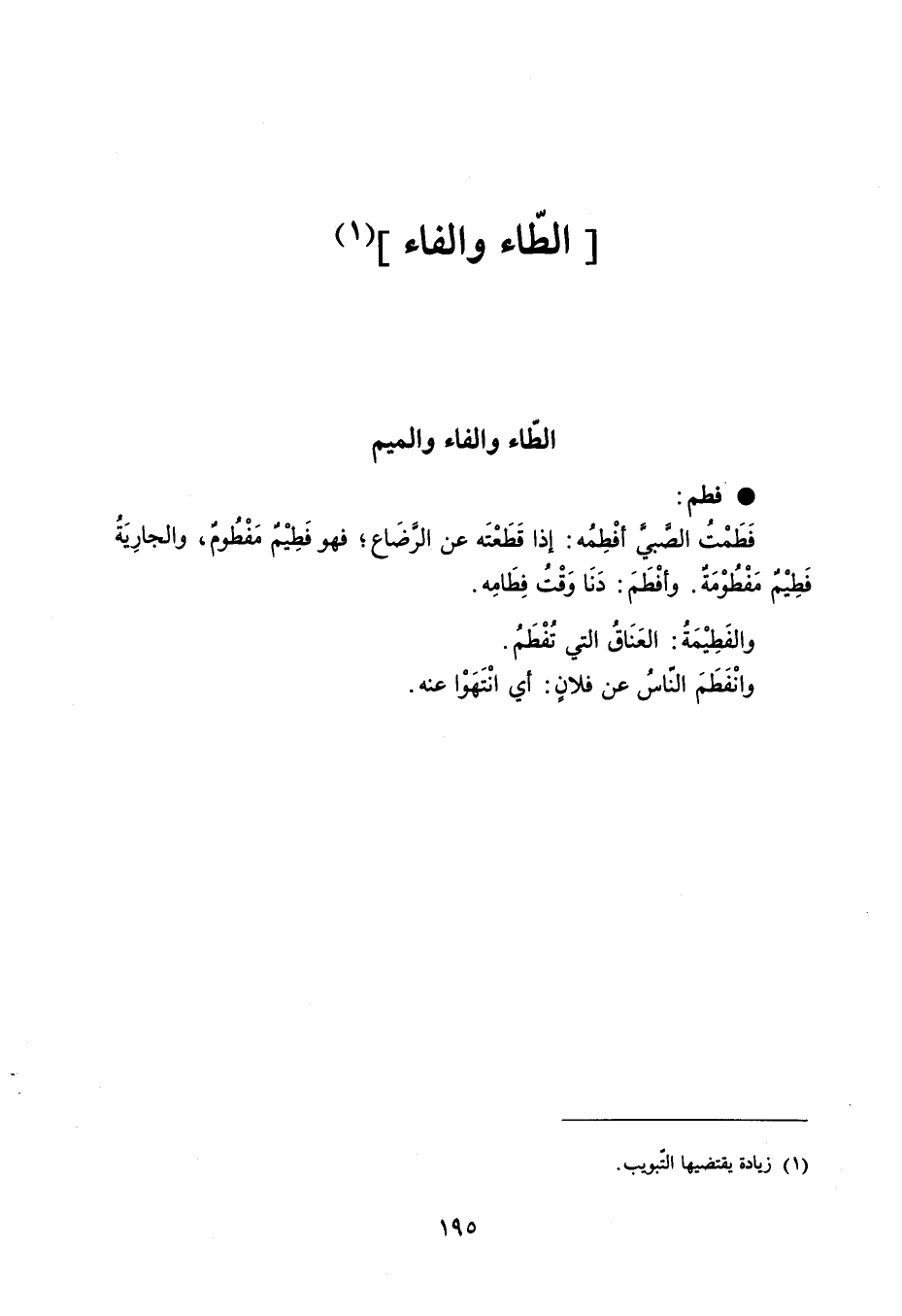فطم فَطَمْتُ الصبي أفْطِمُه : إذا قَطَعْتَه عن الرَّضَاع ؛ فهو فَطِيْمٌ مَفْطُومٌ ، والجارِيَةُ فَطِيْمٌ مَفْطُوْمَة . وأفْطَمَ : دَنَا وَقْت فِطَامِه . والفَطِيْمَةُ : العَنَاقُ التي تُفْطَمُ . وانْفَطَمَ النّاسُ عن فلانٍ : أي انْتَهَوْا عنه .