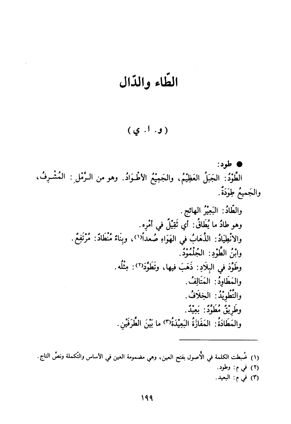 طود الطوْدُ : الجَبَلُ العَظِيْمُ ، والجَمِيْعُ الأطْوَادُ . وهو من الرمْلِ : المشرف ، والجَميعُ طِوَدَةٌ . والطادُ : البَعِيْرُ الهائج . وهو طادٌ ما يُطَاقُ : أي ثَقِيْلٌ في أمْرِه . والانْطِيَادُ : الذهَابُ في الهَوَاءِ صُعداً ، وبِنَاءٌ مُنْطَادٌ : مُرْتَفِعٌ . وابْنُ الطَوْدِ : الجُلْمُوْدُ . وطَوَدَ في البِلاد : ذَهَبَ فيها ، وتَطَودَ : مِثْلُه . والمَطَاوِدُ : المَتَالِفُ . والتطْويدُ : الخِلافُ . وطَرِيْقٌ مُطَودٌ : بَعِيْدٌ . والمَطَادَةُ : المَفَازَةُ البَعِيْدَةُ ما بَيْنَ الطَرَفَيْنِ .