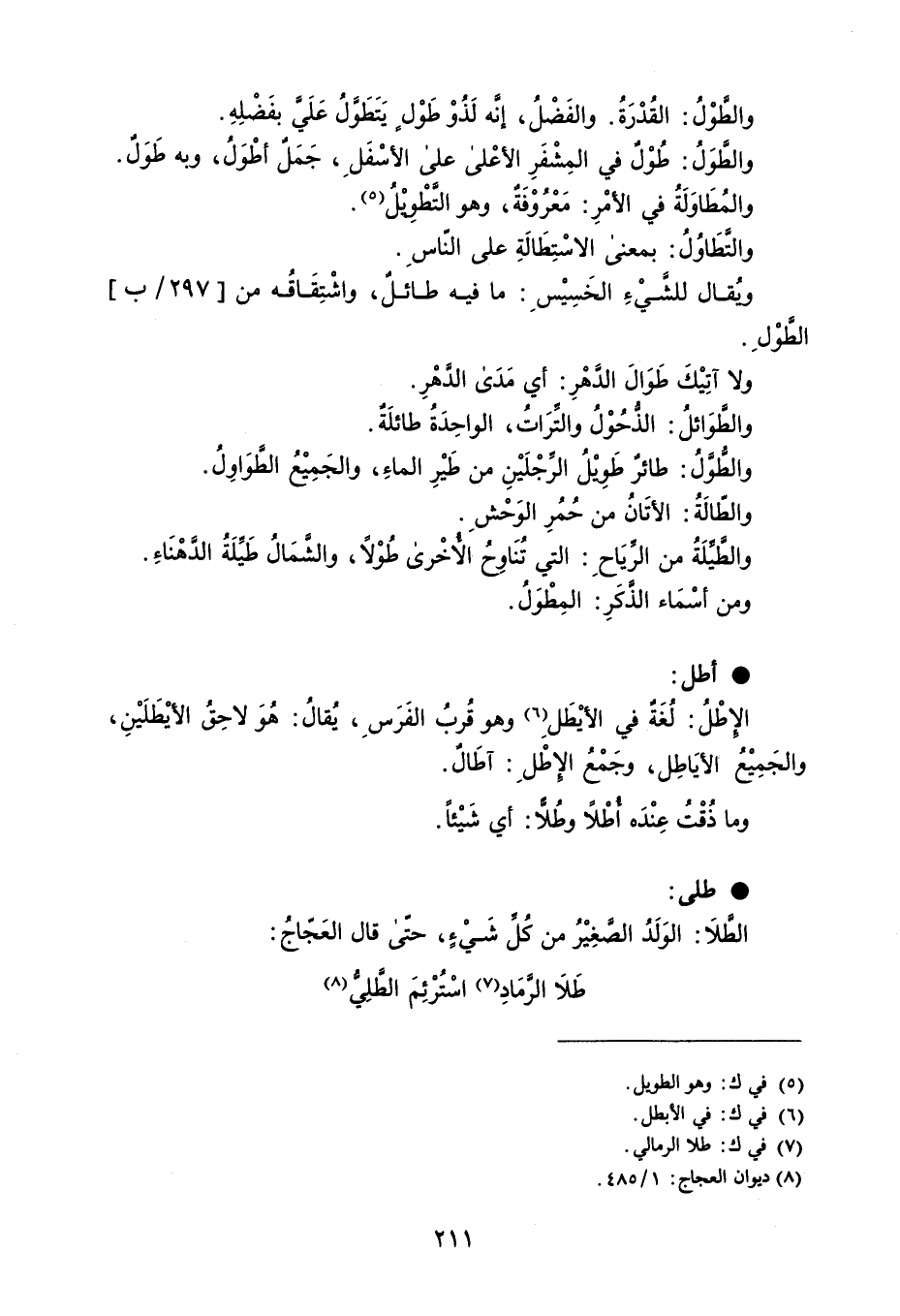 والطوْلُ : القُدْرَةُ . والفَضْلُ ، إنَه لَذُوْ طَوْلٍ يَتَطَولُ عَلَي بفَضْلِهِ . والطَّوَلُ : طُوْلٌ في المِشْفَرِ الأعْلى على الأسْفَلِ ، جَمَلٌ أطْوَلُ ، وبه طَوَلٌ . والمُطَاوَلَةُ في الأمْرِ : مَعْرُوْفَةٌ ، وهو التَّطْوِيلُ . والتطَاوُلُ : بمعنى الاسْتِطَالَةِ على النّاسِ . ويُقال للشيْءِ الخَسِيْسِ : ما فيه طائلٌ ، واشْتِقَاقُه من الطوْلَ . ولا آتِيْكَ طَوَالَ الدهْرِ : أي مَدَى الدَّهْرِ . والطَّوَائلُ : الذُّحُوْلُ والترَاتُ ، الواحِدَةُ طائلَة . والطُوَّلُ : طائرٌ طَويلُ الرجْلَيْنِ من طَيْرِ الماءِ ، والجَمِيْعُ الطَوَاوِلُ . والطالَةُ : الأتَانُ من حُمُرِ الوَحْشِ . والطيلَةُ من الريَاحِ : التي تُنَاوِحُ الأخْرى طُوْلاً ، والشَّمَالُ طَيلَةُ الدهْنَاءِ . ومن أسْمَاء الذكَرِ : المِطْوَلُ . أطل الإطْلُ : لُغَة في الأيْطَل وهو قُربُ الفَرَسِ ، يُقالُ : هُوَ لاحِقُ الأيْطَلَيْنِ ، والجَمِيْعُ الأيَاطِل ، وجَمْعُ الإطْلِ : آطَالٌ . وما ذُقْتُ عِنْدَه أطْلاً وطُلا : أي شَيْئاً . طلى الط : الوَلَدُ الصغِيْرُ من كُل شَيْءٍ ، حتّى قال العَجاج : طَلا الرَّمَادِ اسْتُرْئِمَ الطلي