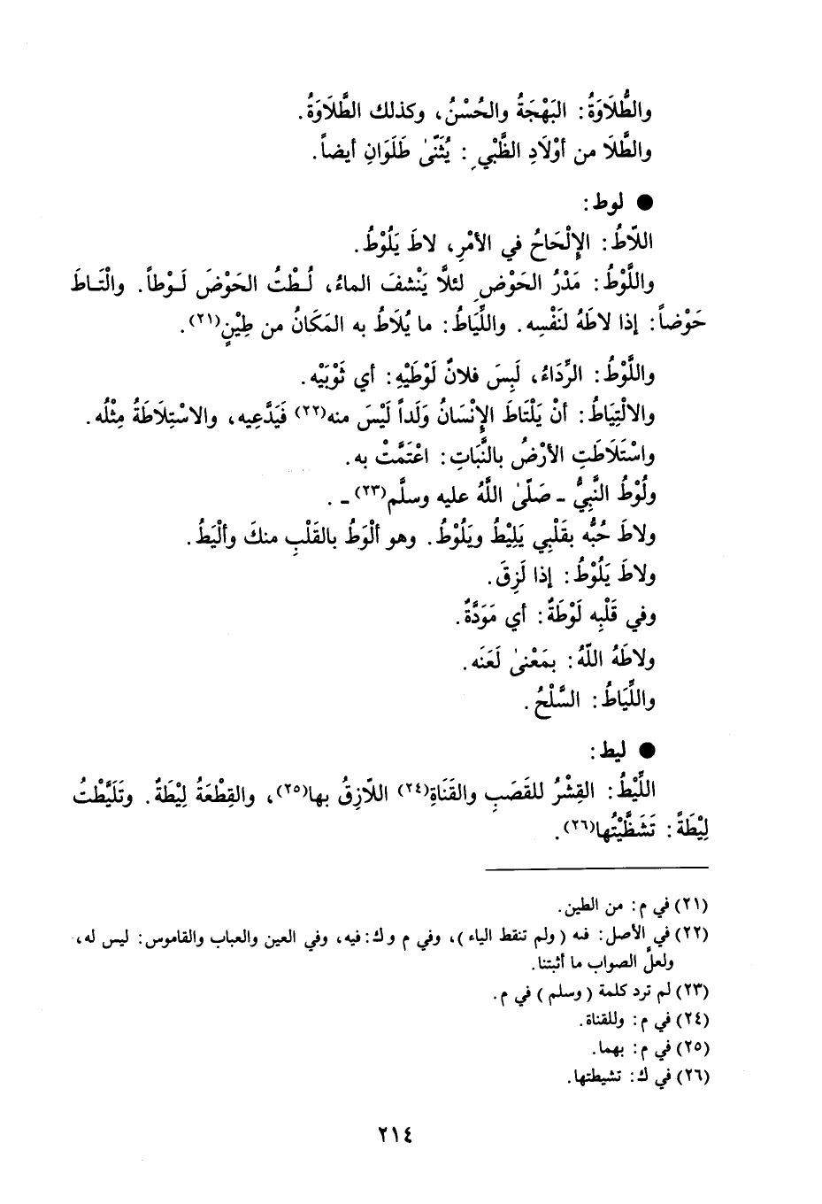 والطلاوَةُ : البَهْجَةُ والحُسْنُ ، وكذلك الطلاَوَةُ . والطلا من أوْلادِ الظبْيِ : يُثَنى طَلَوَانِ أيضاً . لوط اللاطُ : الإلْحَاح في الأمْرِ ، لاطَ يَلُوْطُ . واللوْطُ : مَدْرُ الحَوْضِ لئلأ يَنْشفَ الماءُ ، لطْتُ الحَوْضَ لَوْطاً . والْتَاطَ حَوْضاً : إذا لاطَهُ لنَفْسِه . والليَاط : ما يُلاَطُ به المَكَانُ من طِيْنٍ . واللوْطُ : الردَاءُ ، لَبِسَ فلان لَوْطَيْهِ : أي ثَوْبَيْه . والالْتِيَاطُ : أنْ يَلْتَاطَ الإنْسَانُ وَلَداً لَيْسَ منه فَيَدَّعِيه ، والاسْتلاطَةُ مِثْلُه . واسْتَلاَطَتِ الأرْضُ بالنَّبَاتِ : اعْتَمتْ به . ولُوْطُ النبِي - صَلى اللَّهُ عليه وسلم - . ولاطَ حُبه بقَلْبِي يَلِيْطُ وَيلوْطُ . وهو ألْوَطُ بالقَلْبِ منكَ وألْيَطُ . ولاطَ يَلُوْطُ : إذا لَزِقَ . وفي قَلْبِه لَوْطَةٌ : أي مَوَدة . ولاطَة اللّهُ : بمَعْنى لَعَنَه . واللَيَاطُ : السلْحُ . ليط الليْطُ : القِشْرُ للقَصَب والقَنَاةِ اللاّزِقُ بها ، والقِطْعَةُ لِيْطَةٌ . وتَلَيطْتُ لِيْطَةً : تَشَظيْتُها .
