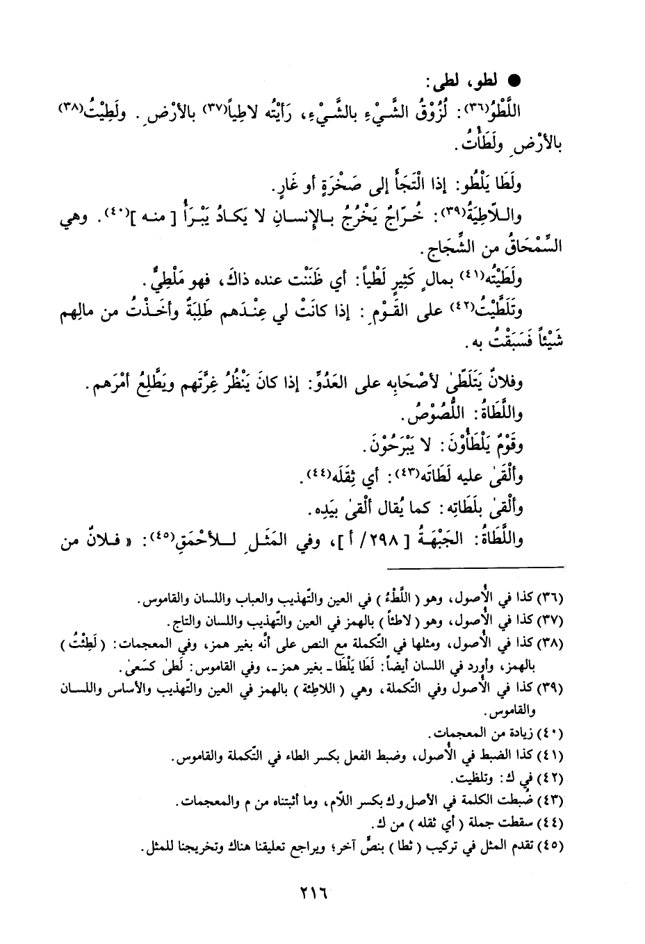 لطو ، لطى اللَّطْوُ : لُزُوْقُ الشَّيْءِ بالشَّيْءِ ، رَأيْتُه لاطِياً بالأرْضِ . ولَطِيْتُ بالأرْضِ ولَطَأتُ . ولَطَا يَلْطُو : إذا الْتَجَأ إلى صَخْرَةٍ أو غَارٍ . واللاطِيَةُ : خُرّاجٌ يَخْرُجُ بالإنسانِ لا يَكادُ يَبْرأ منه . وهي السمْحَاقُ من الشِّجَاج . ولَطَيْتُه بمالٍ كَثِيرٍ لَطْياً : أي ظَنَنْت عنده ذاكَ ، فهو مَلْطِي . وتَلَطَيْتُ على القَوْمِ : إذا كانَتْ لي عِنْدَهم طَلِبَةٌ وأخَذْتُ من مالِهم شيْئاً فَسَبَقْتُ به . وفلانٌ يَتَلَطّى لأصْحَابِه على العَدُوِّ : إذا كانَ يَنْظُرُ غِرَّتَهم وَيطَّلِعُ أمْرَهم . واللَطَاةُ : اللُّصُوْصُ . وقَوْمٌ يَلْطَأوْنَ : لا يَبْرَحُوْنَ . وألْقَى عليه لَطَاتَه : أي ثِقَلَه . وألْقى بلَطَاتِه : كما يُقال ألْقى بيَدِه . واللطَاةُ : الجَبْهَةُ ، وفي المَثَلِ للأحْمَقِ : ' فلانٌ من