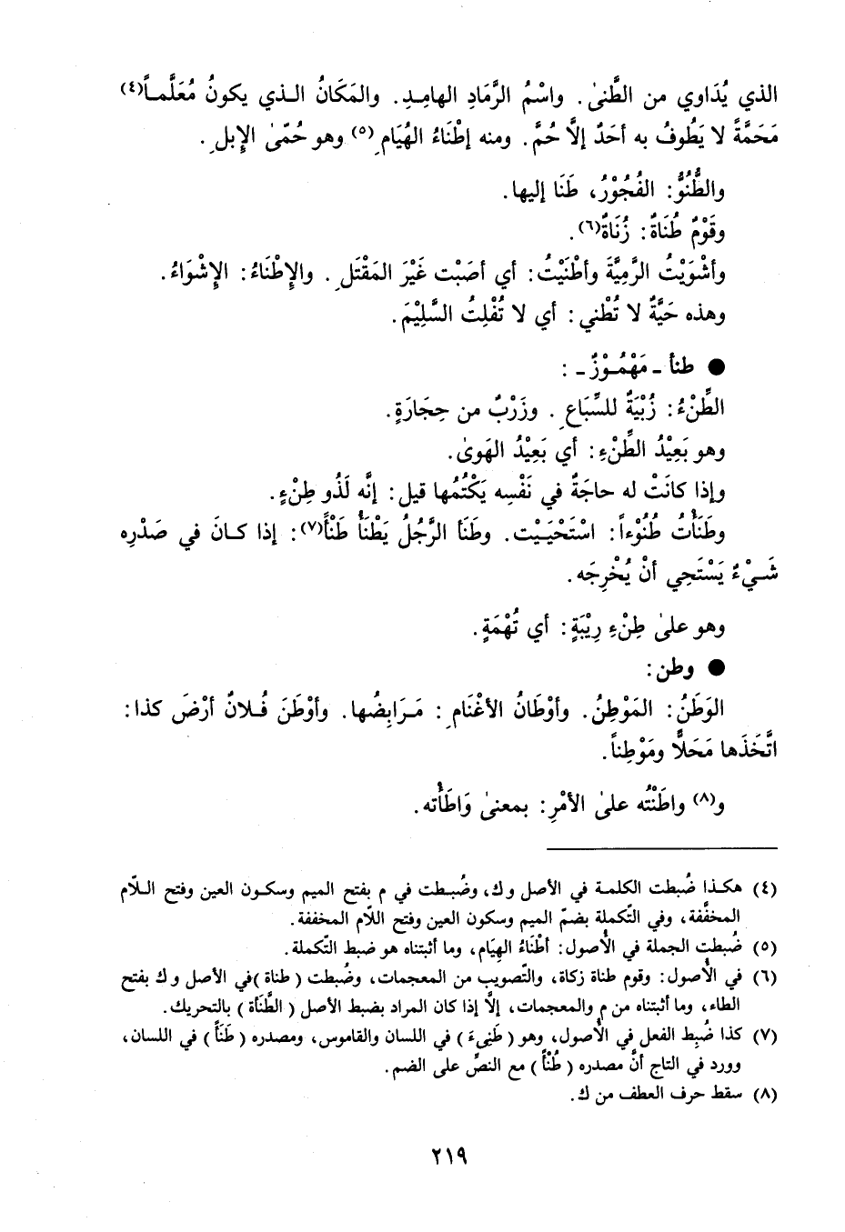 الذي يُدَاوي من الطنى . واسْمُ الرمَادِ الهامِدِ . والمَكَانُ الذي يكونُ مُعَلَماً مَحَمةً لا يَطُوفُ به أحَد إلا حُم . ومنه إطْنَاءُ الهُيَامِ وهوحُمّى الإبلِ . والطُنُو : الفُجُوْرُ ، طَنَا إليها . وقَوْمٌ طُنَاةٌ : زُنَاةٌ . وأشويتُ الرمِيةَ وأطْنَيْتُ : أي أصَبْت غَيْرَ المَقْتَلِ . والإطْنَاءُ : الإشْوَاءُ . وهذه حَيَّةٌ لا تُطْني : أي لا تُفْلِتُ السَّلِيْمَ . طنأ - مَهْمُوْز - الطَنْءُ : زُبْيَةٌ للسِّبَاعِ . وزَرْبٌ من حِجَارَةٍ . وهوبَعِيْدُ الطِّنْءِ : أي بَعِيْدُ الهَوى . وإذا كانَتْ له حاجَةٌ في نَفْسِه يَكْتُمُها قيل : إنَه لَذُو طِنْءٍ . وطَنَأتُ طُنُؤْاً : اسْتَحْيَيْت . وطَنَا الرجُلُ يَطْنَأ طَنْأً : إذا كانَ في صَدْرِه شَيْء يَسْتَحِي أنْ يُخْرِجَه . وهوعلى طِنْءِ رِيْبَةٍ : أي تُهْمَةٍ . وطن الوَطَن : المَوْطِنُ . وأوْطَانُ الأغْنَامِ : مَرَابِضُها . وأوْطَنَ فُلانٌ أرْضَ كذا : اتخَذَها مَحَلاً ومَوْطِناً . وأطننته على الأمر : بمعنى واطأته .