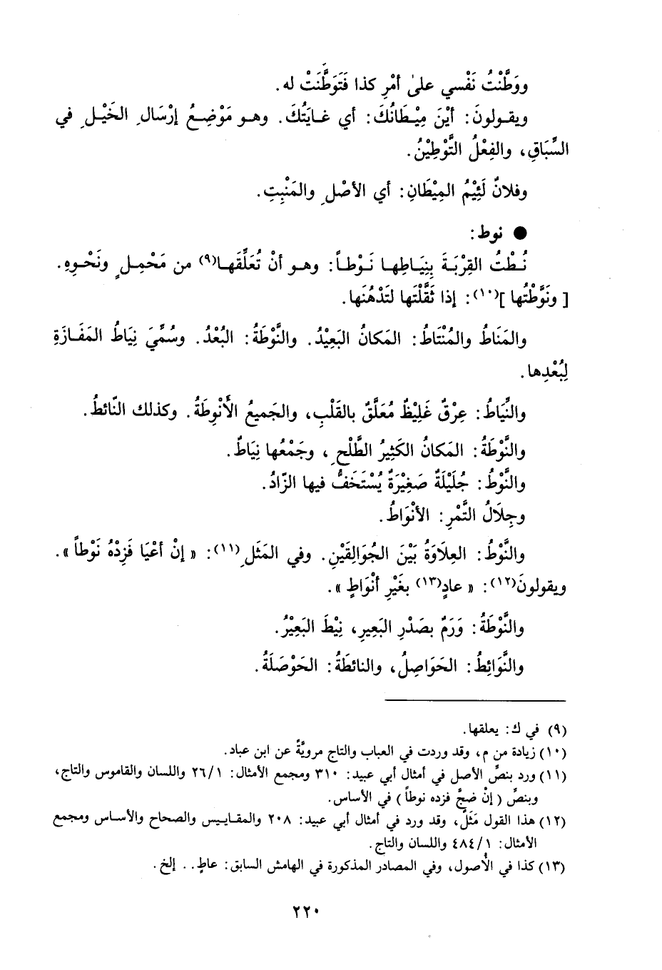 ووَطنْتُ نَفْسي على أمْرِكذا فَتَوَطَنَتْ له . ويقولونَ : أيْنَ مِيْطَانُكَ : أي غايَتُكَ . وهو مَوْضِعُ إرْسَالِ الخَيْلِ في السبَاقِ ، والفِعْلُ التَّوْطِيْنُ . وفلانٌ لَئِيْمُ المِيْطَانِ : أي الأصْلِ والمَنْبِتِ . نوط نُطْتُ القِرْبَةَ بِنِيَاطِها نَوْطاً : وهو أنْ تُعَلِّقَها من مَحْمِل ونَحْوِهِ . ونَوطْتُها : إذا ثَقلْتَها لتَدْهُنَها . والمَنَاطُ والمُنْتَاطُ : المَكانُ البَعِيْدُ . والنَّوْطَةُ : البُعْدُ . وسُميَ نِيَاطُ المَفَازَةِ لِبُعْدِها . والنيَاطُ : عِرْقٌ غَلِيْظ مُعَلقٌ بالقَلْبِ ، والجَميعُ الأنْوِطَةُ . وكذلك النّائطُ . والنوْطَةُ : المَكانُ الكَثِيرُ الطَّلْحِ ، وجَمْعُها نِيَاطٌ . والنَّوْطُ : جُلَيْلَةٌ صَغِيْرَةٌ يُسْتَخَفُّ فيها الزّادُ . وجِلالُ التمْرِ : الأنْوَاطُ . والنوْطُ : العِلاوَةُ بَيْنَ الجُوَالِقَيْنِ . وفي المَثَلِ : ' إنْ أعْيَا فَزِدْهُ نَوْطاً ' . ويقولونَ : ' عادٍ بغيْرِ أنْوَاطٍ ' . والنوْطَةُ : وَرَمٌ بصَدْرِ البَعِيرِ ، نِيْطَ البَعِيْرُ . والنَّوَائِطُ : الحَوَاصِلُ ، والنائطَةُ : الحَوْصَلَةُ .
