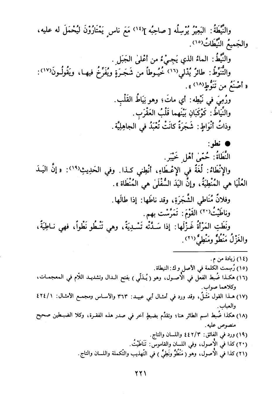 والنيطَةُ : البَعِيْرُ يُرْسِلُه أصاحِبُه مَعَ ناسٍ يَمْتَارُوْنَ ليُحْمَلَ له عليه ، والجَميعُ النَيطَاتُ . والنَيِّطُ : الماءُ الذي يَجِيْءُ من أعْلى الجَبَلِ . والتنَوطُ : طائرٌ يُدْلي خُيُوطاً من شَجَرَةٍ وُيفَرِّخُ فيها ، ويَقُولُونَ : أصْنَعُ من تَنَوطٍ . ورُمِيَ في نَيْطِه : أي ماتَ ؛ وهو نِيَاطُ القَلْبِ . والنَيَاطُ : كَوْكَبَانِ بَيْنَهما قَلْبُ العَقْرَبِ . وذاتُ أنْوَاطٍ : شَجَرَةٌ كانَتْ تُعْبَدُ في الجاهِلِية . نطو النَطَاةُ : حُمّى أهْلِ خَيْبَر . والإنْطَاءُ : لُغَةٌ في الإعْطَاءِ ، أنْطِني كذا . وفي الحَدِيثِ : ' إنَّ اليَدَ العُلْيَا هي المُنْطِيَةُ ، وإنَ اليَدَ السُّفْلَى هي المُنْطَاة ' . وفلانٌ مُنَاطي الشجَرَةِ ، وقد ناطَها : إذا طالَها . وناطَيْتُ القَوْمَ : تَمَزَستْ بهم . ونَطَتِ المَرْأةُ غَزْلَها : إذا سَدَتْه تَسْدِيَةً ، وهي تَنْطُو نَطْواً ، فهي ناطِيَةٌ ، والغزْلُ مَنْطُو ومَنْطِي .