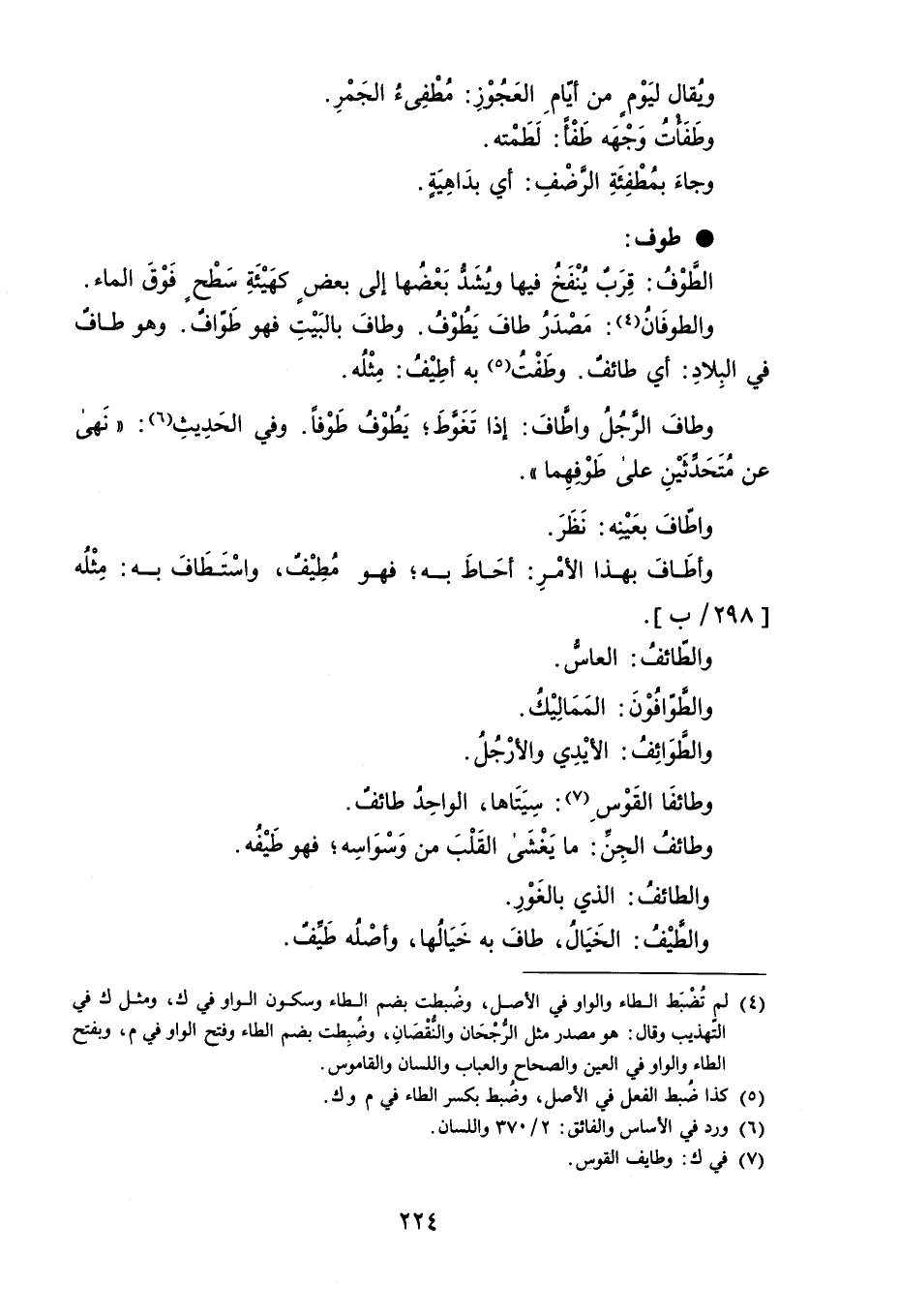 وُيقال ليَوْمٍ من أيامِ العَجُوْزِ : مُطْفِىءُ الجَمْرِ . وطَفَأتُ وَجْهَه طَفْاً : لَطَمْته . وجاءَ بمُطْفِئَةِ الرَّضْفِ : أي بدَاهِيَةٍ . طوف الطَوْفُ : قِرَبٌ يُنْفَخُ فيها وُيشَدُ بَعْضُها إلى بعضٍ كهَيْئَةِ سَطْحٍ فَوْقَ الماء . والطوفَانُ : مَصْدَرُ طافَ يَطُوْفُ . وطافَ بالبَيْتِ فهو طَوافٌ . وهو طاف في البِلادِ : أي طائف . وطَفْتُ به أطِيْفُ : مِثْلُه . وطافَ الرجُلُ واطافَ : إذا تَغَوَّطَ ؛ يَطُوْفُ طَوْفاً . وفي الحَدِيثِ : انَهى عن مُتَحَدثَيْنِ على طَوْفِهِما ' . واطافَ بعَيْنِه : نَظَرَ . وأطَافَ بهذا الأمْرِ : أحَاطَ به ؛ فهو مُطِيْفٌ ، واسْتَطَافَ به : مِثْلُه . والطائفُ : العاس . والطوّافُوْنَ : المَمَالِيْكُ . والطَّوَائِفُ : الأيْدِي والأرْجُلُ . وطائفَا القَوْسِ : سِيَتَاها ، الواحِدُ طائفٌ . وطائفُ الجِن : ما يَغْشَى القَلْبَ من وَسْوَاسِه ؛ فهوطَيْفُه . والطائفُ : الذي بالغَوْرِ . والطيْفُ : الخَيَالُ ، طافَ به خَيَالُها ، وأصْلُه طَيِّفٌ .