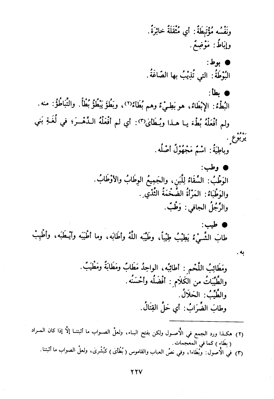 وَنفْسُه مُؤتبِطَةٌ : أي مُثْقَلَةٌ خاثِرَةٌ . وإبَاط : مَوْضِع . بوط البُوْطَةُ : التي تُذِيْبُ بها الصاغَةُ . بطأ البُطْءُ : الإبْطَاءُ ، هو بَطِيْء وهم بُطَاءُ ، وبَطُؤَ يَبْطُؤُ بُطْاً . والتَّبَاطُؤُ : منه . ولم أفْعَلْهُ بُطْءَ يا هذا وبُطَأى : أي لم أفْعَلْهُ الدَّهْرَ ؛ في لُغَةِ بَني يَرْبُوْع . وباطِيَةُ : اسْمٌ مَجْهُوْلٌ أصْلُه . وطب الوَطْبُ : السقَاءُ لِلبَن ، والجَمِيعُ الوِطَابُ والأوْطَابُ . والوَطْبَاءُ : المَرْأةُ الضخْمَةُ الثَّدْيِ . والرجُلُ الجافي : وَطْبٌ . طيب طابَ الشيْءُ يَطِيْبُ طِيْباً ، وطَيبَه اللَّهُ وأطَابَه ، وما أطْيَبَه وأيْطَبَه ، وأطْيِبْ به . ومَطَائِبُ اللحْمِ : أطائِبُه ، الواحِدُ مَطَابٌ ومَطَابَةٌ ومَطْيَبٌ . والطَّيبَاتُ من الكَلامِ : أفْضَلُه وأحْسَنُه . والطيبُ : الحَلالُ . وطابَ الضرَابُ : أي حَلَّ القِتَالُ .