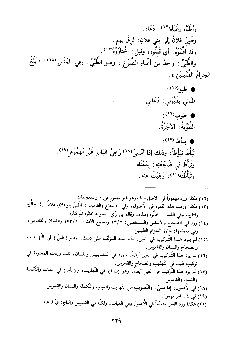 وأطْبَأه وطَبَأه : دَعَاه . وطَبِيَ فلانٌ إلى بني فلانٍ : لَزِقَ بهم . وقد اطَّبَوْهُ : أي قَبِلُوه ، وقيل : اخْتَارُوْهُ . والطُبْيُ : واحِد من أطْبَاءِ الضرْعِ ، وهو الطِّبْيُ . وفي المَثَلِ : ' بلغ الحِزَامُ الطُّبْيَيْنِ ' . طبو طَبَاني يَطْبُوْني : دَعَاني . طوب الطُّوْبَةُ : الأجُرةُ . باط تَبَاَّطَ تَبَؤُّطاً : وذلك إذا أمْسى رَخِيَّ البَالِ غَيْرَ مَهْمُوْمٍ . وتَبَأطَ في ضَجْعَتِه : بِمَعْنَاه . وتَبأطته : رَغِبْتُ عنه .
