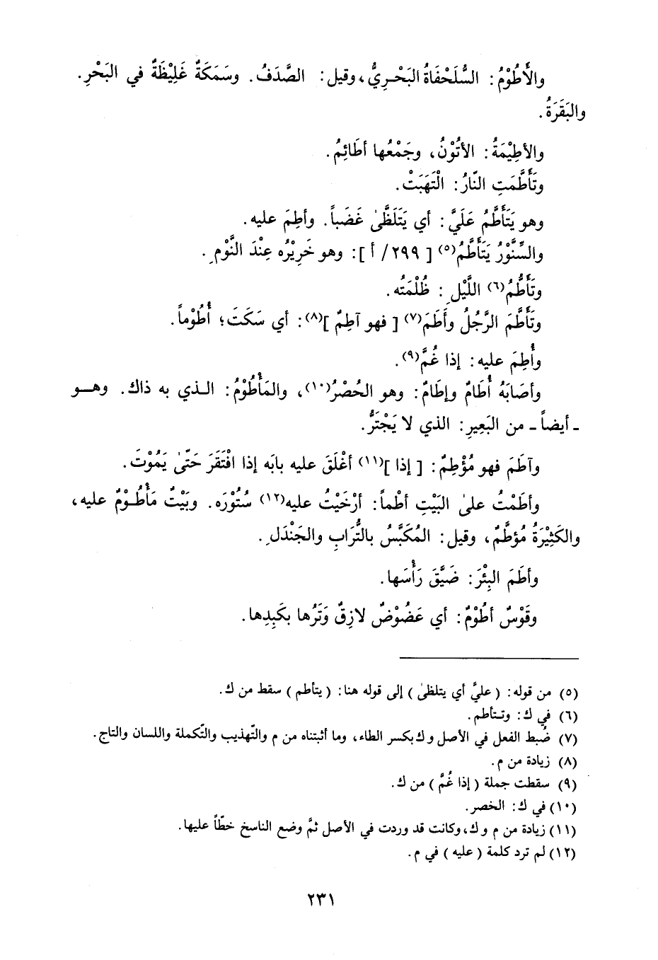 والأطُوْمُ : السُّلَحْفَاةُ البَحْرِيُّ ، وقيل : الصَّدَفُ . وسَمَكَةٌ غَلِيْظَةٌ في البَحْرِ . والبَقَرَةُ . والأطِيْمَةُ : الأتُوْنُ ، وجَمْعُها أطَامُ . وتَأطَّمَتِ النّارُ : الْتَهَبَتْ . وهويَتَأطَّمُ عَلَيَّ : أي يَتَلَظَى غَضَباً . وأطِمَ عليه . والسنَّوْرُ يَتَأطَّمُ : وهو خَرِيْرُه عِنْدَ النَّوْمِ . وتَأطُّمُ اللَّيْلِ : ظُلْمَتُه . وتَأطَّمَ الرجُلُ وأَطَمَ فهو آطِمٌ : أي سَكَتَ ؛ أطُوْماً . وأطِمَ عليه : إذا غُمَّ . وأصَابَهُ أطَائم وإطَامٌ : وهو الحُصْر ، والمَأطُوْمُ : الذي به ذاك . وهو - أيضاً - من البَعِيرِ : الذي لا يَجْتَرُ . وآطَمَ فهو مُؤْطِم : إذا أغْلَقَ عليه بابَه إذا افْتَقَرَ حَتّى يَمُوْتَ . وأطَمْتُ على البَيْمتِ أطْماً : أرْخَيْتُ عليه سُتُوْرَه . وبَيْتٌ مَأطُوْمٌ عليه ، والكَثِيْرَةُ مُؤطَمٌ ، وقيل : المُكَبسُ بالتُّرَابِ والجَنْدَلِ . وأطَمَ البِئْرَ : ضَيقَ رَأسَها . وقَوْس أطُوْم : أي عَضُوْض لازِقٌ وَتَرُها بكَبِدِها .