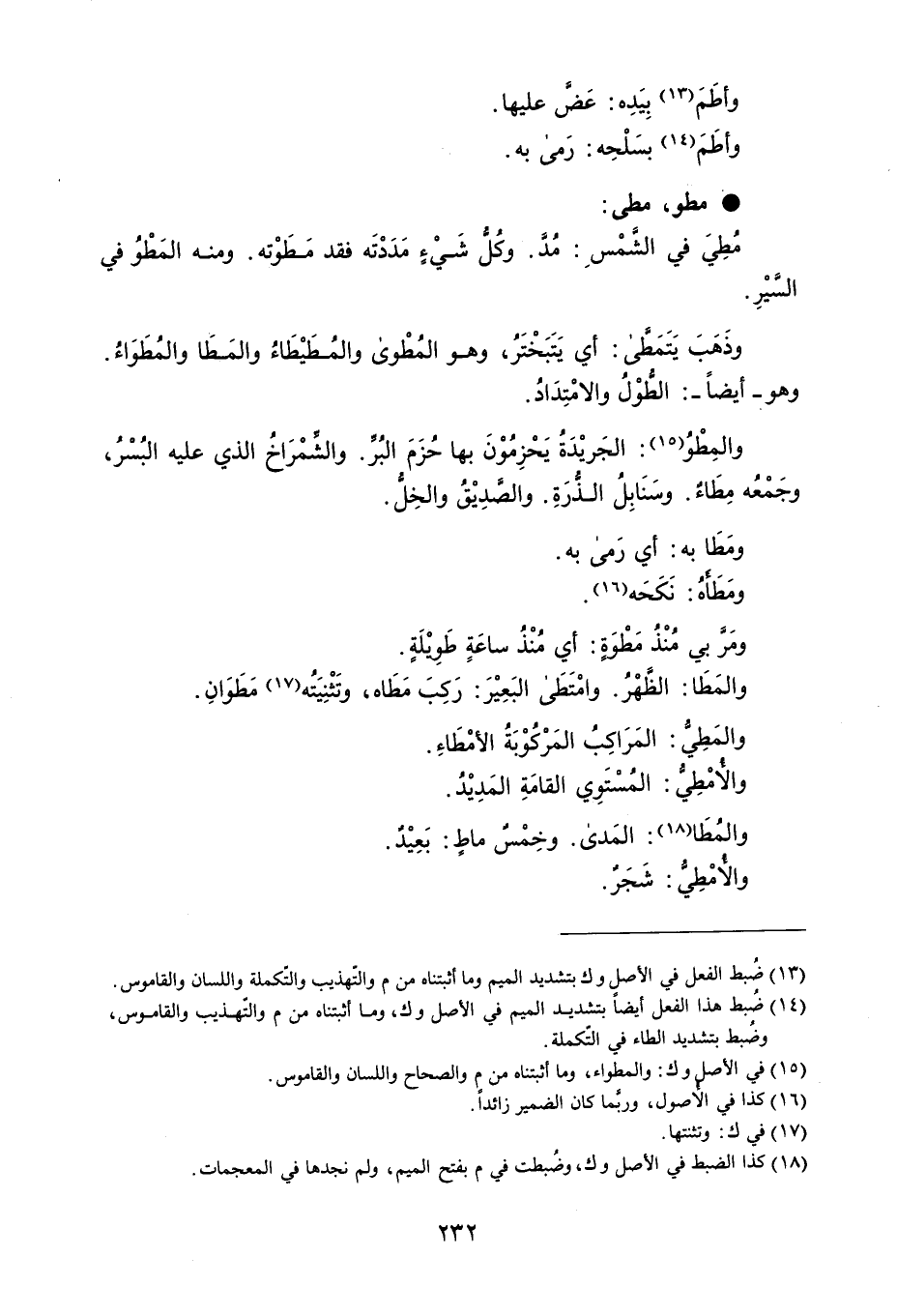وأطَمَ بِيَدِه : عَضَّ عليها . وأطَمَ بسَلْحِه : رَمى به . مطو ، مطى مُطِيَ في الشَّمْسِ : مُدَ . وكُل شَيْء مَدَدْتَه فقد مَطَوْته . ومنه المَطْوُ في السيْرِ . وذَهَبَ يَتَمَطَّى : أي يَتَبَخْتَرُ ، وهو المُطْوى والمُطَيْطَاءُ والمَطَا والمُطَوَاءُ . وهو - أيضاً - : الطُّوْلُ والامْتِدَادُ . والمِطْو : الجَريْدَةُ يَحْزِمُوْنَ بها حُزَمَ البُرِّ . والشِّمْرَاخُ الذي عليه البُسْرُ ، وجَمْعُه مِطَاءٌ . وسَنَابِلُ الذُرَةِ . والصَّدِيْقُ والخِلُّ . ومَطَا به : أي رَمى به . ومَطَأه : نَكَحَه . ومَر بي مُنْذُ مَطْوَةٍ : أي مُنْذُ ساعَةٍ طَويلَةٍ . والمَطَا : الظَّهْرُ . وامْتَطَى البَعِيْرَ : رَكِبَ مَطَاه ، وتَثْنِيَتُه مَطَوَانِ . والمَطِيُّ : المَرَاكِبُ المَرْكُوْبَةُ الأمْطَاءِ . والأمْطِيُّ : المُسْتَوِي القامَةِ المَدِيْدُ . والمُطَا : المَدى . وخِمْسٌ ماطٍ : بَعِيْدٌ . والأمْطِيُ : شَجَرٌ .