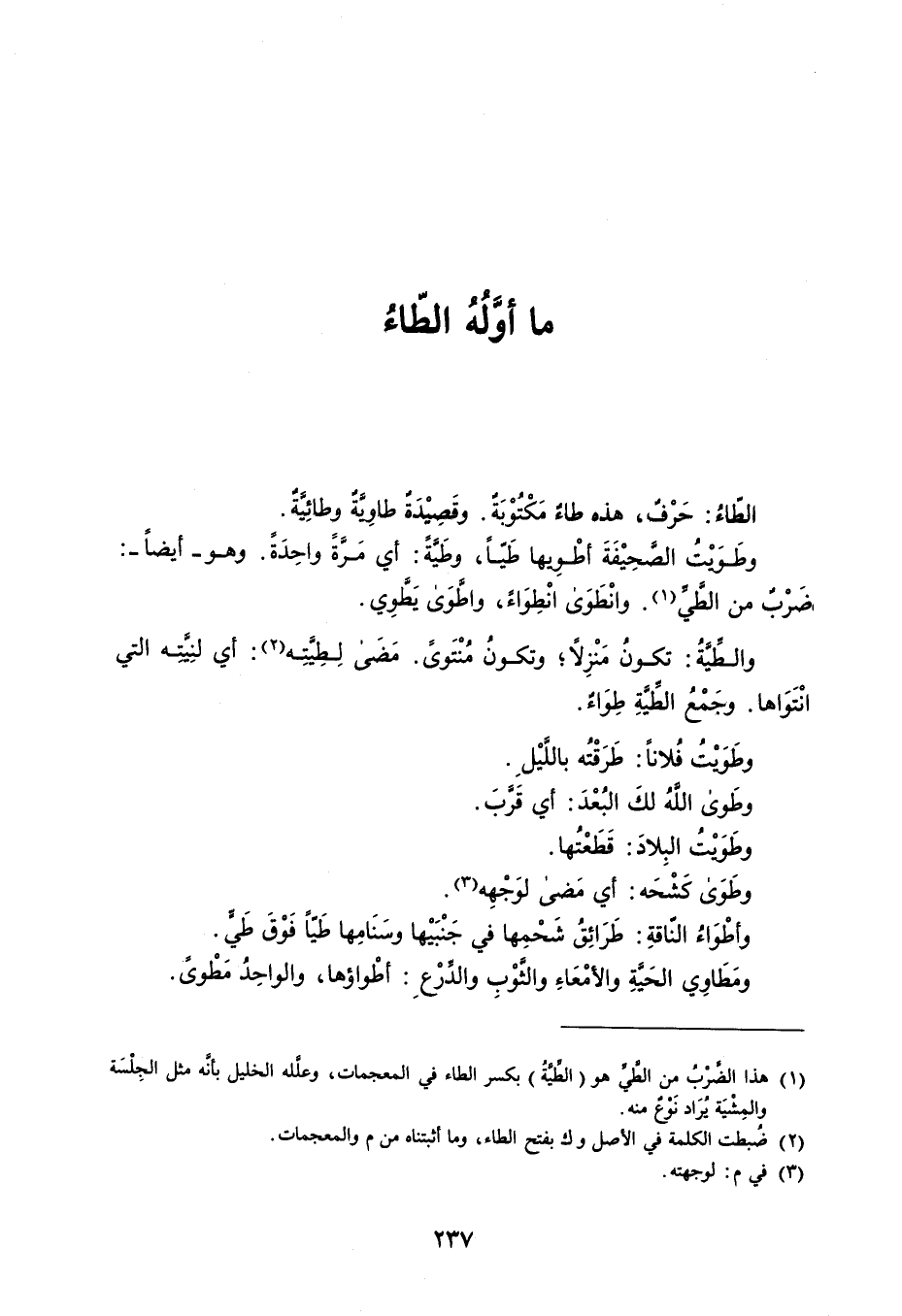 الطاءُ : حَرْفٌ ، هذه طاء مَكْتُوْبَة . وقَصِيْدَةٌ طاوِّيةٌ وطائِيةٌ . وطَوقيُ الصَحِيْفَةَ أطْوِيها طَياً ، وطَيَّةً : أي مَرَّة واحِدَةً . وهو - أيضاً - : ضَرْب من الطي . وانْطَوَى انْطِوَاء ، واطَوَى يَطَوِي . والطيةُ : تكونُ مَنْزِلاً ؛ وتكونُ مُنْتَوى . مَضَى لِطِيتِه : أي لنِيَّتِه التي انْتَوَاها . وجَمْعُ الطِّيةِ طِوَاء . وطَويتُ فُلاناً : طَرَقْتُه بالليْلِ . وطَوى اللهُ لكَ البُعْدَ : أي قَربَ . وطَويت البِلادَ : قَطَعْتُها . وطَوَى كَشْحَه : أي مَضى لوَجْهِه . وأطْوَاءُ الناقةِ : طَرَائِقُ شَحْمِها في جَنْبَيْها وسَنَامِها طَياً فَوْقَ طَي . ومَطَاوِي الحَيةِ والأمعاءِ والثوْبِ والدِّرْعِ : أطْواؤها ، والواحِدُ مَطْوى .