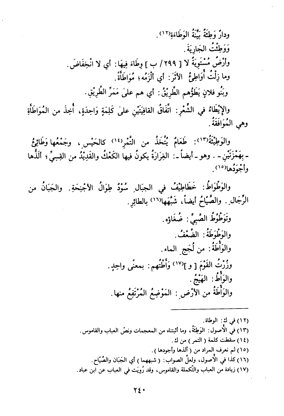 ودار وَطِئَةٌ بَينَةُ الوَطَاءةِ . وَوَطِئْتُ الجَارِيَةَ . وأرْضُ مُسْتَوِيَةٌ لا وِطَاءَ فِيهَا : أي لا انْخِفَاضَ . وما زِلْتُ أوَاطِنُ الأثَرَ : أي ألْزَمُه ؛ مُوَاطَأةً . وبَنُو فلانٍ يَطَؤُهم الطَّرِيْقُ : أي هم على مَمَرِّ الطَّرِيْقِ . والإيْطَاءُ في الشِّعْرِ : اتِّفَاقُ القافِيَتَيْنِ على كَلِمَةٍ وَاحِدَةٍ ، أخِذَ من المُوَاطَأةِ وهي المُوَافَقَةُ . والوَطِيْئَة : طَعَام يُتَّخَذُ من التَمْرِ كالحَيْسِ ، وجَمْعُها وَطَائِئُ - بِهَمْزَتَيْنِ - . وهو - أيضاً - : الغِرَارَةُ يكونُ فيها الكَعْكُ والقَدِيْدُ من القِسِيِّ ؛ ألَذُها وأجْوَدُها . والوَطْوَاطُ : خَطَاطِيْفُ في الجبَالِ سُوْدٌ طِوَالُ الأجْنِحَةِ . والجَبَانُ من الرجَالِ . والصيّاحُ أيضاً ، شَبهَها بالطائِرِ . وتَوَطْوُطُ الصبي : ضُغَاؤه . والوَطْوَطَةُ : الضَععْفُ . والوأطَةُ : من لُجَجِ الماء . وزُرْتُ القَوْمَ و وَأطْتُهم : بمعنى واحِد . والوأط : الهَيْجُ . والوأطَةُ من الأرْضِ : المَوْضِعُ المُرْتَفِعُ منها .