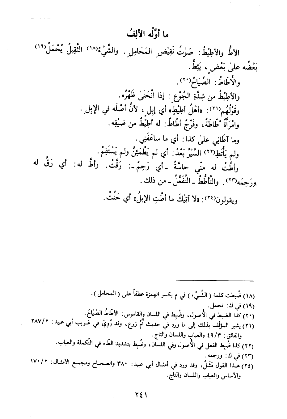 الأطُّ والأطِيْطُ : صَوْتُ نَقِيْضِ المَحَامِلِ . والشَّيْءُ الثقِيلُ يُحْمَلُ بَعْضُه على بَعْضٍ ، يَئِطُّ . والأطَاطُ : الصيَاحُ . والأطِيْطُ من شِدَّةِ الجُوْعِ : إذا انْحَنَى ظَهْرُه . وقَوْلُهُم : ' أهْلُ أطِيْطٍ ' أي إبِل ، لأنَّ أصْلَه في الإِبِلِ . وامْرأةٌ أطّاطَةٌ ، وفَرْجٌ أطّاطٌ : له أطِيْطٌ من ضِيْقِه . وما آطَانِي على كذا : أي ما ساعَفَنِي . ولم يَأتَطِ السيْر بَعْدُ : أي لم يَطْمَئِنَّ ولم يَسْتَقِمْ . وأطَّتْ له منّي حاسَّةٌ - أي رَحِمٌ - : رَقَّتْ . وأط له : أي رق له ورَحِمَه . والتأطُّطُ - التَّفَعُلُ - من ذلك . ويقولون : ' لا آتِيْكَ ما أطَتِ الإبلُ ' أي حَنَّتْ .