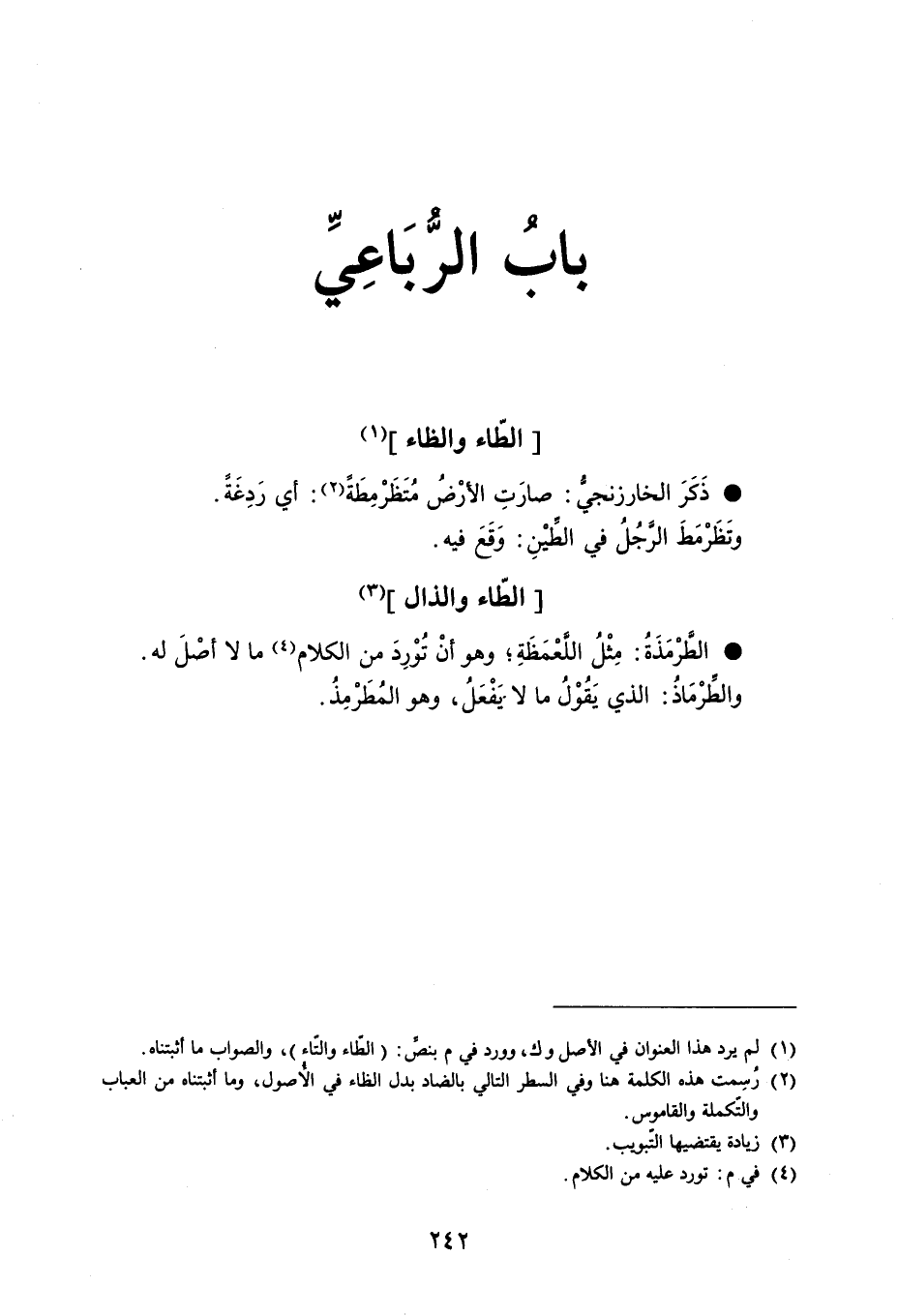 الطّاء والظاء . ذَكَرَ الخارزنجي : صارَتِ الأرْضُ مُتَظَرْمِطَةً : أي رَدِغَة . وتَظَرْمَطَ الرجُلُ في الطِّيْنِ : وَقَعَ فيه . الطّاء والذال . الظَرْمَذَةُ : مِثْلُ اللعْمَظَةِ ؛ وهو أنْ توْرِدَ من الكلام ما لا أصْلَ له . والظَرْمَاذُ : الذي يَقُوْلُ ما لا يَفْعَلُ ، وهو المُطَرْمِذُ .