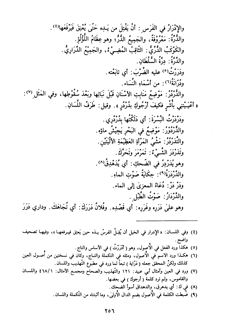 والإدْرَارُ في الفَرَسِ أنْ يَفْتِلَ من يَدِه حَتّى يُعْنِقَ فَيَرْفَعَها . والذُرَّةُ مَعْرُوْفَة ، والجَمِيعُ الدُّرُ ؛ وهو عِظَامُ اللُّؤْلُؤِ . والكَوْكَبُ الدُّريُّ الثاقِبُ المُضِيْءُ ، والجَمِيْعُ الدَّرَارِيُّ . والدَرَّةُ دِرَّةُ السُّلْطَانِ . ودَرَرْتُ عليه الضَرْبَ أي تابَعْته . ودُرّانَةُ من أسْمَاءِ النَسَاء . والدُرْدُرُ مَوْضِعُ مَنَابِتِ الأسْنَانِ قَبْلَ نَبَاتِها وبَعْدَ سُقُوْطِها ، وفي المَثَلِ أعْيَيْتنِي بأشُرٍ فكيفَ أرْجُوكِ بدُرْدُرٍ ' . وقيل طَرَفُ اللِّسَانِ . ودَرْدَرْتُ البُسْرَةَ أي دَلَكْتُها بِدُرْدُرِي . والدُرْدُوْرُ مَوْضِعٌ في البَحْرِ يَجِيْش ماؤه . والتدَرْدُرُ مَشْيُ المَرْأةِ العَظِيْمَةِ الألْيَتَيْنِ . وتَدَرْدَرَ الشَّيْءُ تَمَرْمَر وتَحَرَّكَ . وهو يُدَرْدِرُ في الضّحكِ أي يُدَهْدِقُ . والدَّرْدَرَةُ حِكَايَةُ صَوْتِ الماءِ . ودَرْدَرْ دُعَاءُ المعزى إلى الماء . والدَّرْدَارُ صَوْتُ الطَبْلِ . وهو على دَرَرِه وغَرَرِه أي قَصْدِه . وفُلانٌ دَرَرَكَ أي تُجَاهَكَ . وداري دَرَرَ