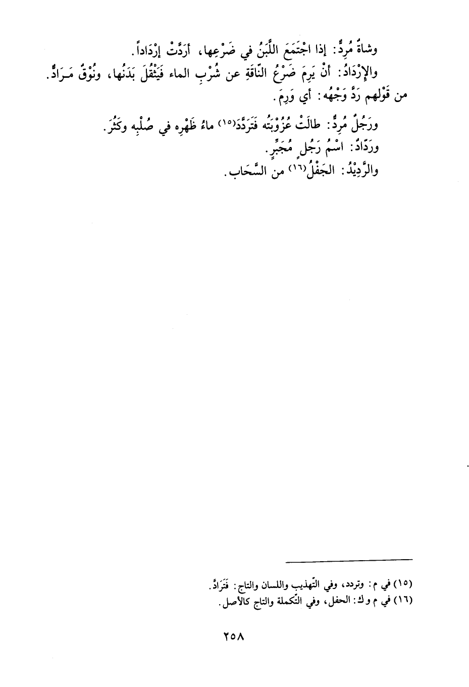 وشاة مُرِد : إذا اجْتَمَعَ اللَّبَنُ في ضَرْعِها ، أرَدَّتْ إرْدَاداً . والإرْدَادُ : أنْ يَرِمَ ضرْعُ النّاقَةِ عن شُرْبِ الماء فَيَثْقُلَ بَدَنُها ، ونُوْق مَرَاد . من قَوْلهم رَدَّ وجْهُه : أي وَرِمَ . ورَجُلٌ مُرِدّ : طالَتْ عُزُوْبَتُه فَتَرَدَّدَ ماءُ ظَهْرِه في صُلْبِه وكَثُرَ . ورَدّادٌ : اسْمُ رَجُل مُجَبِّرٍ . والرَّدِيْدُ : الجَفْلُ من السَّحَاب .