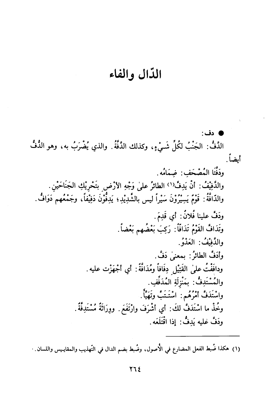 دف الدف : الجَنْبُ لكُلِّ شَيْءٍ ، وكذلك الدَّفَةُ . والذي يُضْرَبُ به ، وهو الدُّفُّ أيضاً ودَفتَا المُصْحَفِ : ضِمَامُه . والدَفِيْفُ : أنْ يَدِفَّ الطائرُ على وَجْهِ الأرْضِ بتَحْرِيْكِ الجَنَاحَيْنِ . والدّافَّةُ : قَوْمٌ يَسِيْرُوْنَ سَيْراً ليس بالشَّدِيْدِ ؛ يَدِفُّوْنَ دَفِيْفاً ، وجَمْعُهم دَوَافُّ . ودَفَّ علينا فُلان : أي قَدِمَ . وتَدَافَ القَوْمُ تَدَافّاً : رَكِبَ بَعْضُهم بَعْضاً . والدَفِيْفُ : العَدْوُ . وأدَفَّ الطائرُ : بمعنى دَفَ . ودافَفْتُ على القَتِيْلِ دِفَافاً ومُدَافةً : أي أجْهَزْت عليه . والمُسْتَدِفُ : بمَنْزِلَةِ المُدَفَفِ . واسْتَدَفَّ أمْرُهُم : اسْتَتَبَّ وتَهَيأ . وخُذْ ما اسْتَدَف لكَ : أي أشْرَفَ وارْتَفَعَ . ووِرَاثَة مُسْتَدِفَّةٌ . ودَفَ عليه يَدِفُّ : إذا اقْتَلَعَه .