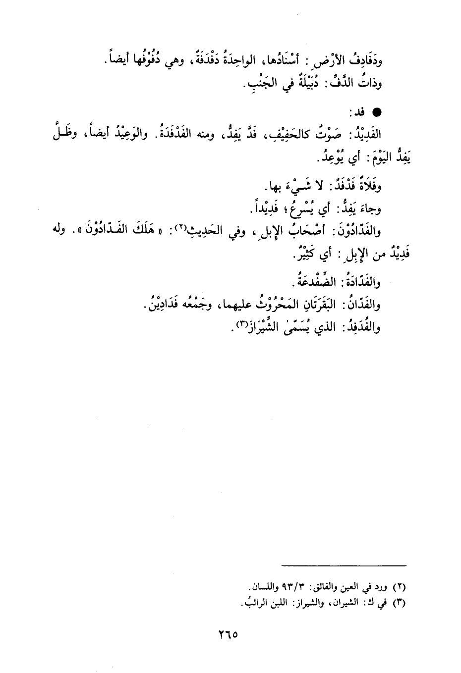 ودَفَادِفُ الأرْضِ : أسْنَادُها ، الواحِدَةُ دَفْدَفَةٌ ، وهي دُفُوْفُها أيضاً . وذاتُ الدَّفِّ : دُبَيْلَةٌ في الجَنْبِ . فد الفَدِيْدُ : صَوْتٌ كالحَفِيْفِ ، فَدَّ يَفِدُّ ، ومنه الفَدْفَدَةُ . والوَعِيْدُ أيضاً ، وظَلَّ يَفِدُ اليَوْمَ : أي يُوْعِدُ . وفَلاةٌ فَدْفَدٌ : لا شَيْءَ بها . وجاءَ يَفِدُّ : أي يُسْرعُ ؛ فَدِيْداً . والفَدّادُوْنَ : أصْحَابُ الإِبلِ ، وفي الحَدِيثِ : ' هَلَكَ الفَدّادُوْنَ ' . وله فَدِيْدٌ من الإبِلِ : أي كَثِيْرٌ . والفَدّادَةُ : الضِّفْدعَةُ . والفَدانُ : البَقَرَتَانِ المَحْرُوْثُ عليهما ، وجَمْعُه فَدَادِيْنُ . والفُدَفِدُ : الذي يُسَمى الشِّيْرَازَ .