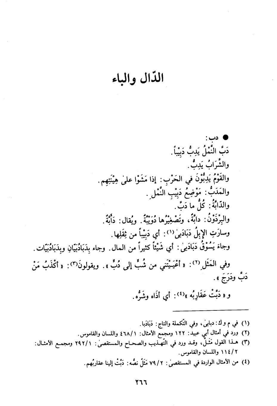 دب دَبَّ النَمْلُ يَدِبُّ دَبِيْباً . والشرَابُ يَدِبُ . والقَوْمُ يَدِبُّوْنَ في الحَرْبِ : إذا مَشَوْا على هِيْنَتِهِم . والمَدَب : مَوْضِعُ دَبِيْبِ النَّمْلِ . والدابةُ : كُلُ ما دَب . والبِرْدَوْنُ : دابَةٌ ، وتَصغِيْرُها دُويبةٌ . ويُقال : دابَّةٌ . وسارَتِ الإبِلُ دَبَادَبى : أي دَبِيْباً من ثِقَلِها . وجاءَ يَسُوْقُ دَبَادَبى : أي شَيْئاً كثيراً من المال . وجاء بِدَبَادُبَيانِ وبِدَبَادُبَيّات . وفي المَثَلِ : ' أعْيَيْتَني من شُب إلى دُبّ ' . ويقولونَ : ' أكْذَبُ مَنْ دَب ودَرَج ' . و ' دَبَّتْ عَقَارِبُه ' : أي أذَاه وشَرُه .