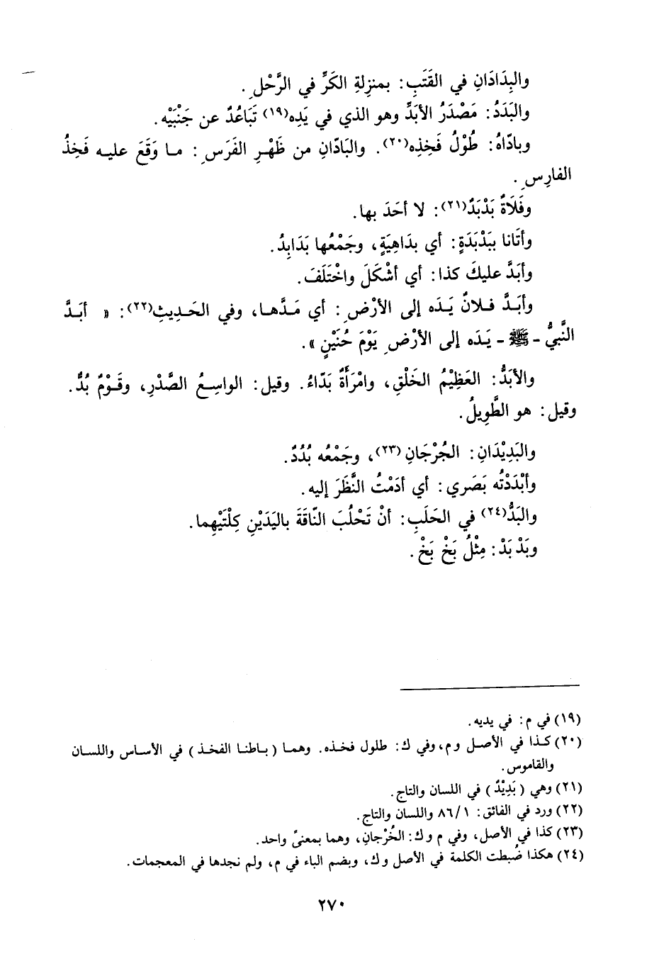 والبِدَادَانِ في القَتَبِ : بمنزِلةِ الكَر في الرَّحْلِ . والبَدَدُ : مَصْدَرُ الأبَدَ وهو الذي في يَدِه تَبَاعُد عن جَنْبَيْه . وبادَاهُ : طوْلُ فَخِذِه . والبَادّانِ من ظَهْرِ الفَرَسِ : ما وَقَعَ عليه فَخِذُ الفارِسَ . وفَلاَةٌ بَدْبَدٌ : لا أحَدَ بها . وأتَانا ببَدْبَدَةٍ : أي بدَاهِيَة ، وجَمْعُها بَدَابِدُ . وأبَد عليكَ كذا : أي أشْكَلَ واخْتَلَفَ . وأبَد فلان يَدَه إلى الأرْضِ : أي مَدها ، وفي الحَدِيثِ : ' أبَدَ النبي ـ صلى الله عليه وسلم ـ يَدَه إلى الأرْضِ يَوْمَ حُنَيْنٍ ' . والأبَد : العَظِيْمُ الخَلْقِ ، وامْرأة بَدّاءُ . وقيل : الواسِعُ الصدْرِ ، وقَوْمٌ بُد . وقيل : هو الطوِيلُ . والبَدِيْدَانِ : الجُرْجَانِ ، وجَمْعُه بُدُدٌ . وأبْدَدْتُه بَصَري : أي أدَمْتُ النظَرَ إليه . والبَد في الحَلَبِ : أنْ تَحْلُبَ الناقَةَ باليَدَيْنِ كِلْتَيْهِما . وبَدْبَدْ : مِثْلُ بَخْ بَخْ .