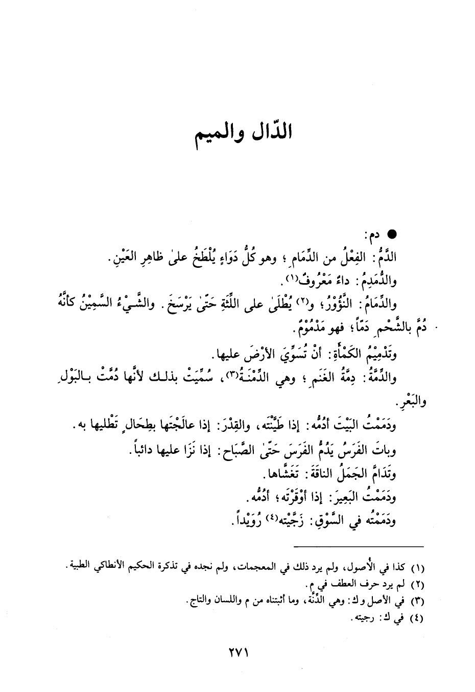 دم الدَّمُّ : الفِعْلُ من الدِّمَامِ ؛ وهو كُلُّ دَوَاءٍ يُلْطَخُ على ظاهِرِ العَيْنِ . والدُمَدِمُ : داءٌ مَعْرُوفٌ . والدَمَامُ : النَؤُوْرُ ؛ و يُطْلَى على اللِّثَةِ حَتّى يَرْسَخَ . والشَّيْءُ السمِيْنُ كأنَهُ دُمَ بالشحْمِ دَماً ؛ فهو مَدْمُوْمٌ . وتَدْمِيْمُ الكَمْأةِ : أنْ تُسَوَيَ الأرْضَ عليها . والدَمنَةُ : دِمةُ الغَنَمِ ؛ وهي الدِّمْنَةُ ، سُمَيَتْ بذلك لأنَّها دُمتْ بالبَوْلِ والبَعْرِ . ودَمَمْتُ البَيْتَ أدُمُه : إذا طَيَّنْتَه ، والقِدْرَ : إذا عالَجْتَها بطِحَالٍ تَطْليها به . وباتَ الفَرَسُ يَدُمُ الفَرَسَ حَتى الصَبَاح : إذا نَزَا عليها دائباً . وتَدَامَ الجَمَلُ الناقَةَ : تَغَشَّاها . ودَمَمْتُ البَعِيرَ : إذا أوْقَرْتَه ؛ أدُمه . ودَمَمْتُه في السوْقِ : زَجَيْته رُويداً .