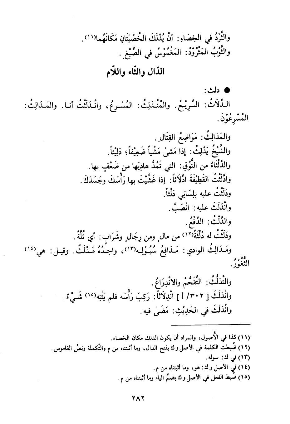 دلث الدلاثُ : الدرِيْثُ . والمُنْدَلِثُ : المُسْرعُ ، وانْدَلَثْتُ أنا . والمَدَالِثُ : المسرعون . والمَدَالِثُ : مَوَاضِعُ القِتَالِ . والشيْخُ يَدْلِثُ : إذا مَشى مَشْياً ضَعِيْفاً ؛ دَلِيْثاً . والدَّلْثَاءُ من النُوْقِ : التي تَمُدُّ هادِيَها من ضَعْفٍ بها . وادَلَثْتُ القَطِيْفَةَ ادِّلَاثاً : إذا غَشَّيْتَ بها رَأسَكَ وجَسَدَكَ . ودَلَثْتُ عليه بلِسَانِي دَلْثاً . وانْدَلَثَ عليه : انْصَبَّ . والدَلْثُ : الدَّفْعُ . ودَلَثْتُ له دُلْثَةً من مالٍ ومن رِجَالٍ وشَرَابِ : أي ثُلَّةً . ومَدَالِثُ الوادي : مَدَافِعُ سُيُوْلِه ، واحَدُهُ مَدْلَثٌ . وقيل : هي الثغُوْرُ . والتَدَلُثُ : التَّقَحُّمُ والانْدِرَاعُ . وانْدَلَثَ انْدِلَاثاً : رَكِبَ رَأسَه فلم يَثْنِه شَيْءٌ . وانْدَلَثَ في الحَدِيْثِ : مَضَى فيه .