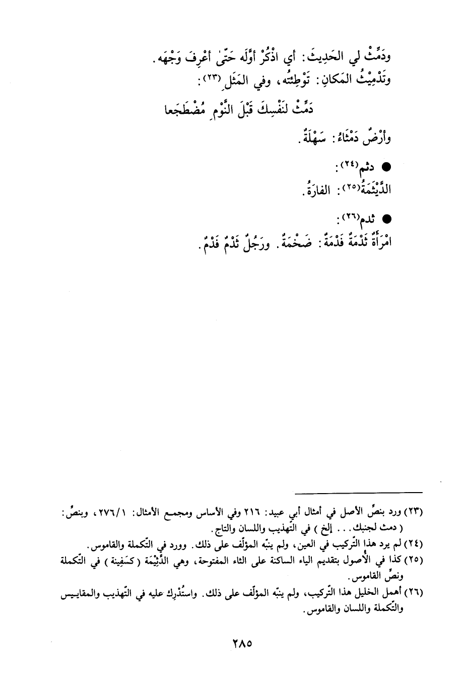 ودَمِّثْ لي الحَدِيثَ : أي اذْكُرْ أوَلَه حَتّى أعْرِفَ وَجْهَه . وتَدْمِيْثُ المَكانِ : تَوْطِئتُه ، وفي المَثَلِ : دَمِّثْ لنَفْسِكَ قَبْلَ النَوْمِ مُضْطَجَعا وأرْضٌ دَمْثَاءُ : سَهْلَةٌ . دثم الدَيْثَمَة : الفارَةُ . ثدم امْرَأة ثَدْمَة فَدْمَةٌ : ضَخْمَة . ورَجُل ثَدْمٌ فَدْمٌ .
