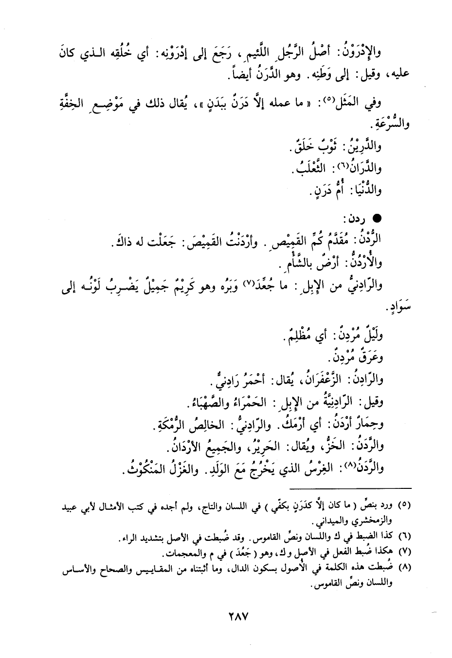 والإدْرَوْنُ : أصلُ الرَّجُلِ اللَئيمِ ، رَجَعَ إلى إدْرَوْنه : أي خُلُقِه الذي كانَ عليه ، وقيل : إلى وَطَنِه . وهو الدَّرَنُ أيضاً . وفي المَثَل : ' ما عمله إلا دَرَنٌ ببَدَنٍ ' ، يُقال ذلك في مَوْضِعِ الخِفَّةِ والسُرْعَةِ . والدَّرِيْنُ : ثَوْب خَلَقٌ . والدَّرَانُ : الثَّعْلَبُ . والدُّنْيَا : أمُ دَرَنٍ . ردن الرُّدْن : مُقَدَّمُ كُم القَمِيْصِ . وأرْدَنْتُ القَمِيْصَ : جَعَلْت له ذاكَ . والأرْدُنُ : أرْضٌ بالشَّأم . والرّادِنيُّ من الإبِلِ : مَا جُعَدَ وَبَرُه وهو كَرِيْمٌ جَمِيْلٌ يَضْرِبُ لَوْنُه إلى سواد . ولَيْلٌ مُرْدِنٌ : أي مظْلِمٌ . وعَرَق مردِن . والرّادِنُ : الزَّعْفَرَانُ ، يُقال : أحْمَرُ رَادِني . وقيل : الرادِنِيةُ من الإبِلِ : الحَمْرَاءُ والصَّهْبَاءُ . وحِمَارٌ أرْدَنُ : أي أرْمَكُ . والرّادِنيُّ : الخالِصُ الرُّمْكَةِ . والردَنُ : الخَزُ ، وُيقال : الحَرِيْرُ ، والجَمِيعُ الأرْدَانُ . والرَّدَنُ : الغِرْسُ الذي يَخْرُجُ مَعَ الوَلَدِ . والغَزْلُ المَنْكُوْثُ . والمِرْدَنُ :