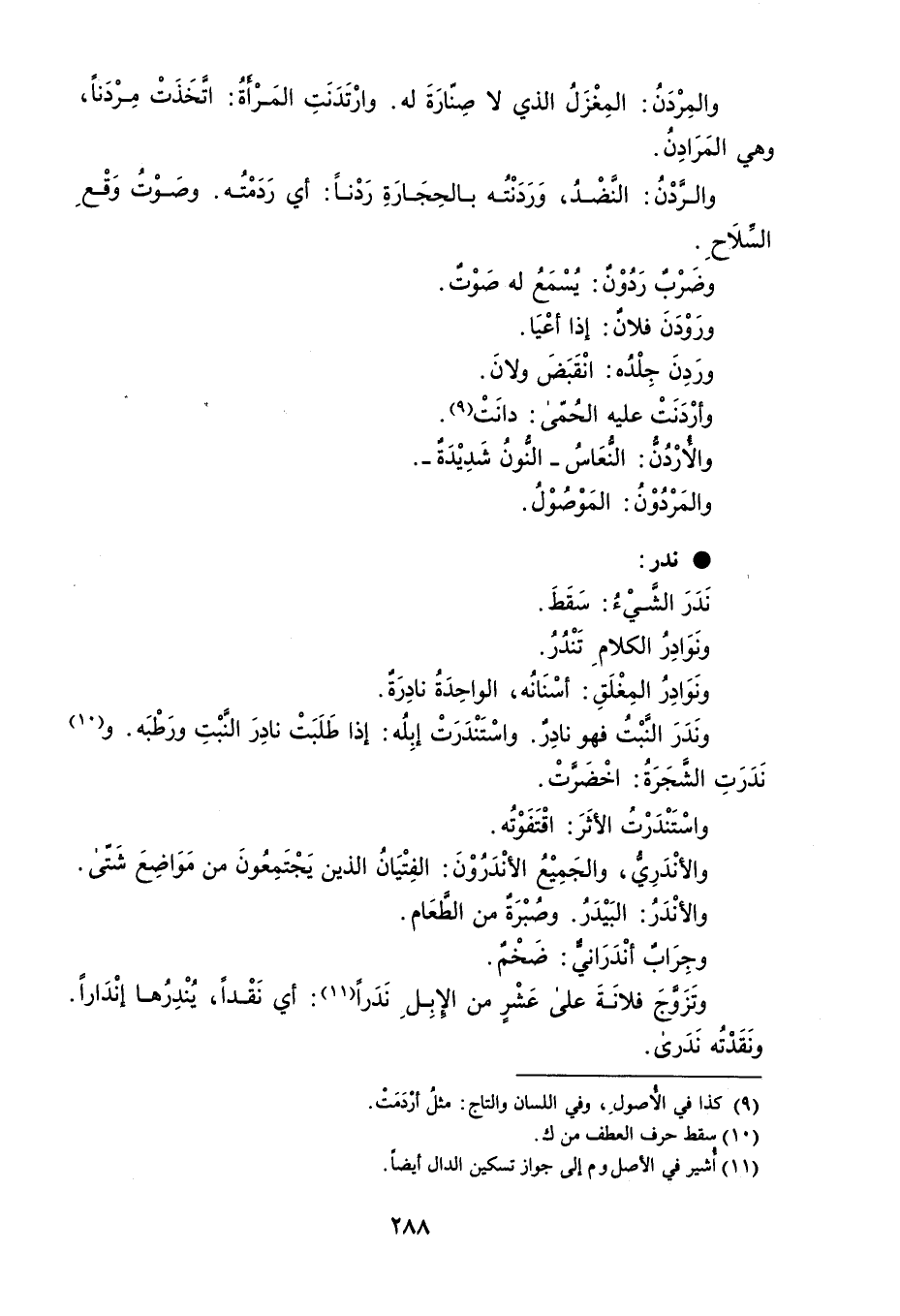 المِغْزَلُ الذي لا صِنّارَةَ له . وارْتَدَنَتِ المَرأةُ : اتَّخَذَتْ مِرْدَناً ، وهي المردان . والردن : النَضْدُ ، وَرَدَنْتُه بالحِجَارَةِ رَدْناً : أي رَدَمْتُه . وصَوْتُ وَقْع السلاح . وضَرْبٌ رَدُوْنُ : يُسْمَعُ له صَوْتٌ . ورَوْدَنَ فلانٌ : إذا أعْيَا . ورَدِنَ جِلْدُه : انْقَبَضَ ولانَ . وأرْدَنَتْ عليه الحُمّى : دانَتْ . والأرْدُنُّ : النُعَاسُ - النُّونُ شَدِيْدَة - . والمَرْدُوْنُ : المَوْصُوْلُ . ندر نَدَرَ الشَّيْءُ : سَقَطَ . ونَوَادِرُ الكلامِ تَنْدُرُ . ونَوَادِرُ المِغْلَقِ : أسْنَانُه ، الواحِدَةُ نادِرَة . ونَدَرَ النَّبْتُ فهو نادِرٌ . واسْتَنْدَرَتْ إبِلُه : إذا طَلَبَتْ نادِرَ النَّبْتِ ورَطْبَه . و نَدَرَتِ الشَّجَرَةُ : اخْضَرتْ . واسْتَنْدَرْتُ الأثَرَ : اقْتَفَوْتُه . والأنْدَرِيُّ ، والجَمِيْعُ الأنْدَرُوْنَ : الفِتْيَانُ الذين يَجْتَمِعُونَ من مَوَاضِعَ شَتّى . والأنْدَرُ : البَيْدَرُ . وصُبْرَةٌ من الطَّعَام . وجِرَاب أنْدَرَاني : ضَخْمٌ . وتَزَوجَ فلانَةَ على عَشْرٍ من الإبِلِ نَدَراً : أي نَقْداً ، يُنْدِرُها إنْدَاراً . ونَقَدْتُه نَدَرى .