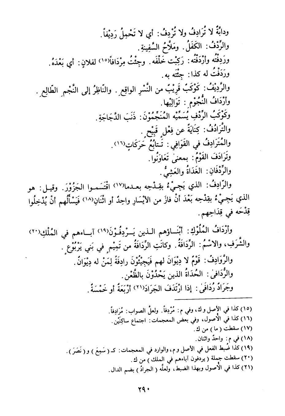 ودابَةٌ لا تُرَادِفُ ولا تُرْدِفُ : أي لا تَحْمِلُ رَدِيْفاً . والردْفُ : الكَفَلُ . ومَلاحُ السَّفِينةِ . ورَدِفْتُه وأرْدَفْتُه : رَكِبْت خَلْفَه . وجِئْتُ مِرْدَافاً لفلانٍ : أي بَعْدَهُ . ورَدَفْتُ له كذا : جِئْتَه به . والردِيْفُ : كَوْكَبٌ قَرِيْبٌ من النَّسْرِ الواقِعِ . والنّاظِرُ إلى النَّجْمِ الطّالِع . وأرْدَافُ النُّجُوْمِ : تَوَالِيْها . وكَوْكَبُ الردْفِ يُسَمِّيْه المُنَجَمُوْنَ : ذَنَبَ الدَّجَاجَةِ . والتَرَادُفُ : كِنَايَةٌ عن فِعْلٍ قَبِيْحٍ . والمُتَرَادِفُ في القَوَافِي : تَتابُع حَرَكَاتٍ . وتَرَادَفَ القَوْمُ : بمعنى تَعَاوَنُوا . والردْفَانِ : الغَدَاةُ والعَشِيُ . والرادِفُ : الذي يَجِيْءُ بقِدْحِه بعدما اقْتَسَموا الجَزُوْرَ . وقيل : هو الذي يَجِيْءُ بقِدْحِه بَعْدَ أنْ فازَ من الأيْسَارِ واحِدٌ أو اثْنَانِ فَيَسْألهم أنْ يُدْخِلُوا قِدْحَه في قِدَاحِهم . وأرْدَاف المُلُوْكِ : أبْنَاؤهم الذين يَرْدِفُوْنَ آباءهم في الملْكِ والشرَفِ ، والاسْمُ : الردَافَةُ . وكانَتِ الرِّدَافَة من تَمِيْمٍ في بَني يَرْبوْعٍ . والروَادِف : قَوْم لا دِيْوَانَ لهم فَيَجِيْئوْنَ رادِفَةً لِمَنْ له دِيْوَانٌ . والرُدَافى : الحُدَاةُ الذين يَحْدُوْنَ بالظَّعْن . وجَرَادٌ ردَافَى : إذا ارْتَدَفَ الجَرَادَ أرْبَعَةٌ أو خَمْسَةٌ .