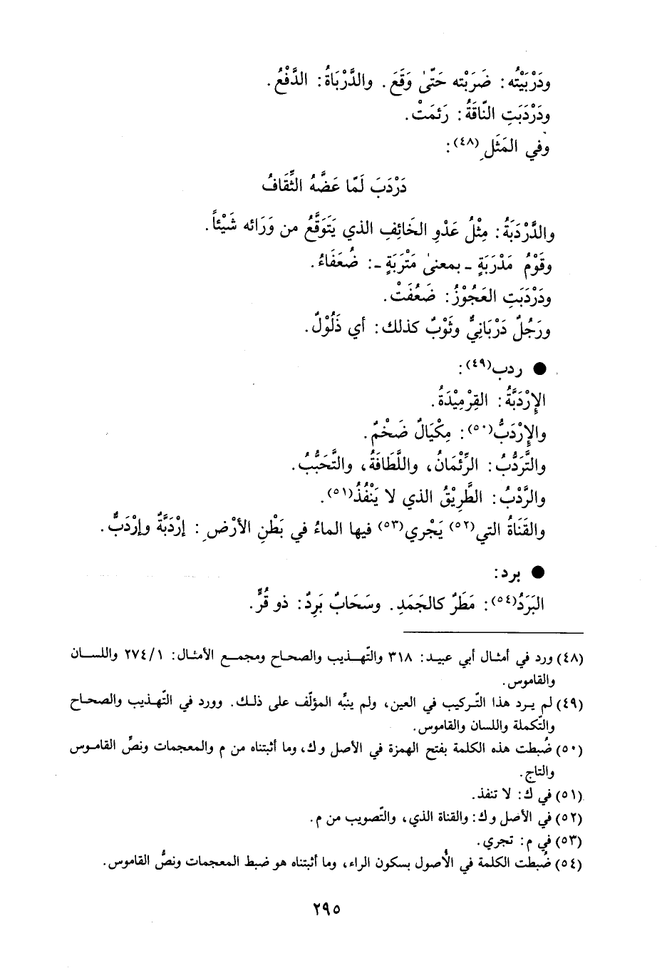 ضَرَبْته حَتّى وَقَعَ . والدَرْبَاةُ : الدَّفْعُ . ودَرْدَبَتِ النّاقَة : رَئمَت . وفي المَثَلَ : دَرْدَبَ لَمّا عَضَّهُ الثِّقَافُ والدرْدَبَةُ : مِثْلُ عَدْوِ الخَائِفِ الذي يَتَوَقَّعُ من وَرَائه شَيْئاً . وقَوْمُ مَدْرَبَةٍ - بمعنىِ مَتْرَبَةٍ - : ضُعَفَاءُ . ودَرْدَبَتِ العَجُوْزُ : ضعُفَت . ورَجُل دَرْبَانِيٌ وثَوْبٌ كذلك : أي ذَلُوْلٌ . ردب الإِرْدَبَّةُ : القِرْمِيْدَةُ . والإرْدَبُ : مِكْيَالٌ ضَخْمٌ . والترَدّبُ : الرِّئْمَانُ ، واللَّطَافَة ، والتَّحَتُبُ . والردْبُ : الطَرِيْقُ الذي لا يَنْفُذُ والقَنَاةُ التي يَجْري فيها الماءُ في بَطْنِ الأرْضِ : إرْدَبَّةٌ وإرْدَب . برد البَرَدُ : مَطَرٌ كالجَمَدِ . وسَحَابٌ بَرِدٌ : ذو قُرٍّ .