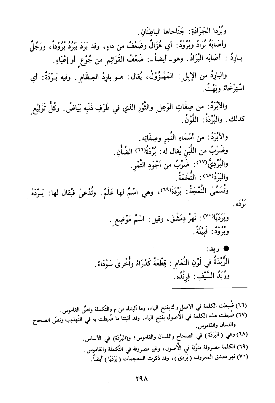 وبرْدا الجَرَادَةِ : جَنَاحاها الباطِنَانِ . وأصَابَهُ بُرَادٌ وبُرُوْدٌ : أي هُزَالٌ وضَعْف من داء ، وقد بَرَدَ يَبْرُدُ بُرُوْداً ، ورَجلٌ بارِدٌ : أصَابَه البُرَادُ . وهو - أيضاً - : ضَعْفُ القَوَائِمِ من جُوْعٍ أو إعْيَاءٍ . والبارِدُ من الإبِلِ : المَهْزُوْلُ ، يُقال : هو بارِدُ العِظَامِ . وفيه بَرْدَةٌ : أي اسْتِرْخَاءٌ وبَهْتٌ . والأبْرَدُ : من صِفَاتِ الوَعِلِ والثَّوْرِ الذي في طَرَفِ ذَنَبِه بَيَاض . وكُلُ تَوْلِيْعٍ كذلك . والبُرْدَةُ : اللَّوْنُ . والأبْرَدُ : من أسْمَاءِ النَمِرِ وصِفَاتِه . وضَرْبٌ من اللبَنٍ يُقال له : بُرْدَةُ الضَأنِ . والبُرْدِيُ : ضرْبٌ من أجْوَدِ التَّمْرِ . والبَرَدُ : التُّخَمَةُ . وتُسَمَن النعْجَةُ : بَرْدَةَ ، وهي اسْمٌ لها عَلَمٌ . وتُدْعى فيُقال لها : بَرْدَهْ برده . وبَرَدَتا : نَهرُ دِمَشْقَ ، وقيل : اسْمُ مَوْضِعٍ . وبُرُوْدٌ : قَبِيْلَة . ربد الرُبْدَةُ في لَوْنِ النعَامِ : قِطْعَةٌ كَدْرَاءُ وأخْرى سَوْدَاءُ . ورُبَدُ السَيْفِ : فِرِنْدُه .
