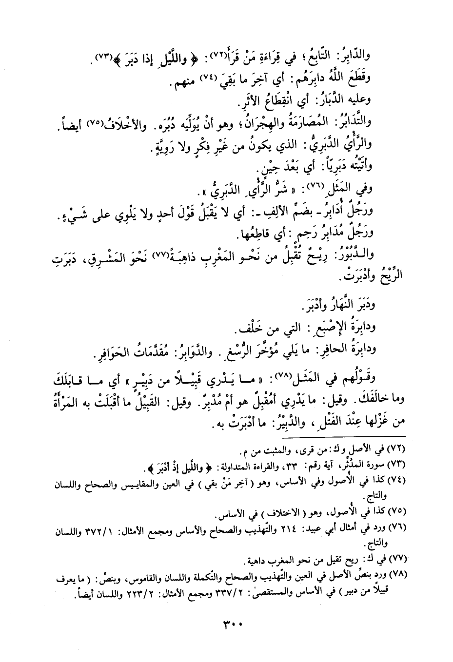 والدابِرُ : التابع ؛ فىِ قِرَاءَةِ مَنْ قَرَأ : ' واللَّيْلِ إذا دَبَرَ ' . وقَطَعَ اللَهُ دابِرَهُم : أي آخِرَ ما بَقِيَ منهم . وعليه الدَّبَارُ : أي انْقِطَاعُ الأثَرِ . والتَّدَابُرُ : المُصَارَمَةُ والهِجْرَانُ ؛ وهو أنْ يُوَلِّيَه دُبُرَه . والأخْلاَفُ أيضاً . والرأيُ الدَّبَرِيُّ : الذي يكونُ من غَيْرِ فِكْرٍ ولا رَوِيةٍ . وأتَيْتُه دَبَرِيّاً : أي بَعْدَ حِيْنٍ . وفي المَثَلِ : ' شَرُ الرأيِ الدَّبَرِيُ ' . ورَجُلٌ أدَابِرُ - بضَمَ الألِفِ - : أي لا يَقْبَل قَوْلَ أحدٍ ولا يَلْوِي على شَيْءٍ . ورَجُلٌ مُدَابِرُ رَحِم : أي قاطِعُها . والدَّبُوْرُ : رِيْحٌ تُقْبِلُ من نَحْو المَغْرِبِ ذاهِبَةً نَحْوَ المَشْرِقِ ، دَبَرَتِ الريْحُ وأدْبَرَتْ . ودَبَرَ النَّهَارُ وأدْبَرَ . ودابِرَةُ الإصْبَعِ : التي من خَلْف . ودابِرَةُ الحافِرِ : ما يَلي مُؤخرَ الرُسغ . والدَّوَابِرُ : مُقَدَمَاتُ الحَوَافِرِ . وقَوْلُهم في المَثَل : ' ما يَدْري قَبِيْلاً من دَبِيْرٍ ' أي ما قابَلَكَ وما خالَفَكَ . وقيل : ما يَدْرِي أمُقْبِلٌ هو أمْ مُدْبِرٌ . وقيل : القَبِيْلُ ما أقْبَلَتْ به المَرأةُ من غَزْلها عِنْدَ الفَتْلِ ، والدَبِيْرُ : ما أدْبَرَتْ به .