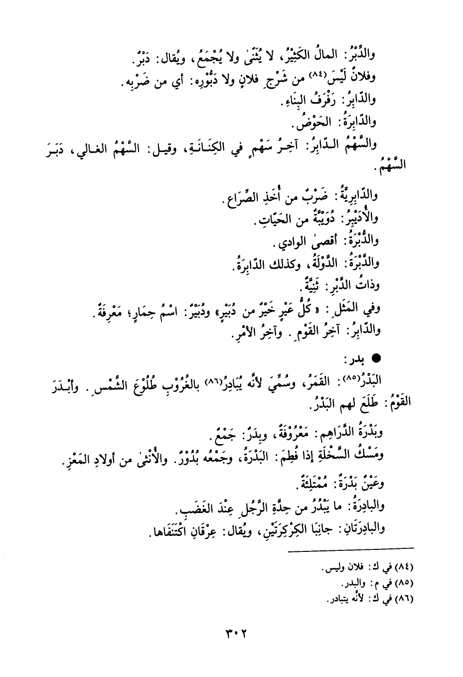 والدَبْرُ : المالُ الكَثِيْرُ ، لا يُثَنى ولا يُجْمَعُ ، وُيقال : دَبْرٌ . وفلانٌ لَيْسَ من شَرْجِ فلانٍ ولا دَبوْرِه : أي من ضَرْبِه . والدّابِرُ : رَفْرَفُ البِنَاءِ . والدّابِرَةُ : الحَوْضُ . والسهْمُ الدابِرُ : آخِرُ سَهْمٍ في الكِنَانَةِ ، وقيل : السَّهْمُ الغالي ، دَبَرَ السهْمُ . والدابِرِةُ : ضَرْب من أخَذِ الصرَاع . والأدَيْبِر : دُوَيْبةٌ من الحَياتِ . والدبْرَةُ : أقصى الوادي . والدبْرَةُ : الدوْلَةُ ، وكذلك الدابِرَةُ . وذاتُ الدبْرِ : ثَنِيةٌ . وفي المَثَلِ : ' كُل عَيْرٍ خَيْرٌ من دُبَيْرٍ ' ودُبَيْرٌ : اسْمُ حِمَارٍ ؛ مَعْرِفَةٌ . والدابِرُ : آخِرُ القَوْمَ . وآخِرُ الأمْرِ . بدر البَدْرُ : القَمَرُ ، وسُميَ لأنَّه يُبَادِرُ بالغُرُوْبِ طُلُوْعَ الشمْسِ . وأبْدَرَ القَوْمُ : طَلَعَ لهم البَدْرُ . وبَدْرَةُ الدرَاهِم : مَعْرُوْفَةٌ ، وبِدَر : جَمْعٌ . ومَسْكُ السخْلَةِ إذا فُطِمَ : البَدْرَةُ ، وجَمْعُه بُدُوْرٌ . والأنْثى من أولادِ المَعْزِ . وعَيْن بَدْرَةٌ : مُمْتَلِئَةٌ . والبادِرَةُ : ما يَبْدُرُ من حِدةِ الرَّجُلِ عِنْدَ الغَضَبِ . والبادِرَتَانِ : جانِبَا الكِرْكِرَتَيْنِ ، وُيقال : عِرْقَانِ اكْتَنَفَاها .