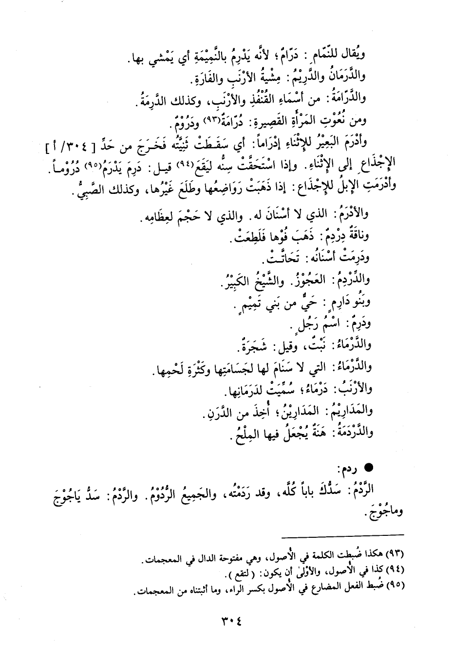 ويُقال للنّمامِ : دَرّامٌ ؛ لأنَّه يَدْرِمُ بالنَّمِيْمَةِ أي يَمْشي بها . والدَّرَمَانُ والدَّرِيْمُ : مِشْيةُ الأرْنَب والفَارَةِ . والدَرّامَةُ : من أسْمَاءِ القُنْفُذِ والأَرْنَبِ ، وكذلك الدَّرِمَةُ . ومن نُعُوْتِ المَرأةِ القَصِيرةِ : دُرّامَةٌ ودَروْمٌ . وأدْرَمَ البَعِيْرُ للإثْنَاءَ إدْرَاماً : أي سَقَطَتْ ثَنِيَّتُه فَخَرَجَ من حَدِّ الإجْذَاعِ إلى الإثْنَاءِ . وإذا اسْتَحَقَّتْ سِنُّه ليَقَعَ قيل : دَرِمَ يَدْرَمُ دُرُوْماً . وأدْرَمَتِ الإبلُ للإجْذَاع : إذا ذَهَبَتْ رَوَاضِعُها وطَلَعَ غَيْرُها ، وكذلك الصَّبِيُّ . والأدْرَمُ : الذي لا أسْنَانَ له . والذي لا حَجْمَ لعِظَامِه . وناقَةٌ دِرْدِمٌ : ذَهَبَ فُوها فَلَطِعَتْ . ودَرِمَتْ أسْنَانُه : تَحَاتتْ . والدِّرْدِمُ : العَجُوْزُ . والشَّيْخُ الكَبِيْرُ . وبَنُو دَارِم : حَي من بَني تمِيْمٍ . ودَرِمٌ : اسمُ رجُل . والدَّرْمَاءُ : نبْت ، وقيل : شَجَرَةٌ . والدَرْمَاءُ : التي لا سَنَامَ لها لجَسَامَتِها وكَثْرَةِ لَحْمِها . والأرْنَبُ : دَرْمَاءُ ؛ سُمَيَتْ لدَرَمَانِها . والمَدَارِيْمُ : المَدَارِيْنُ ؛ أخِذَ من الدَّرَنِ . والدَّرْدَمَةُ : هَنَةٌ يُجْعَلُ فيها المِلْحُ . ردم الردْمُ : سَدُّكَ باباً كُلَه ، وقد رَدَمْتُه ، والجَمِيعُ الرُّدُوْمُ . والرَّدْمُ : سَدُّ يَأجُوْجَ ومأجُوْج .